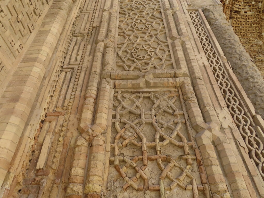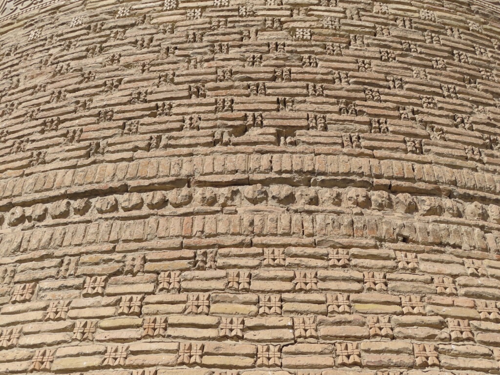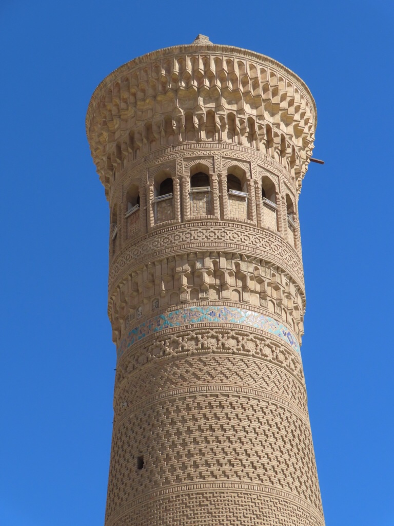 The Kalyan Minaret is the last surviving fragment of the Kara-khanid era mosque built by Mohammad Arslan Khan in 1127, predating the Mongol conquests and one of only a handful of buildings to wholly or partially survive Genghis Khan’s invasions. The ornamentation relied entirely on the brickwork, with the bands of glazed tile near the base of the lantern added since 1920.
