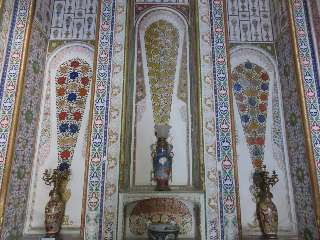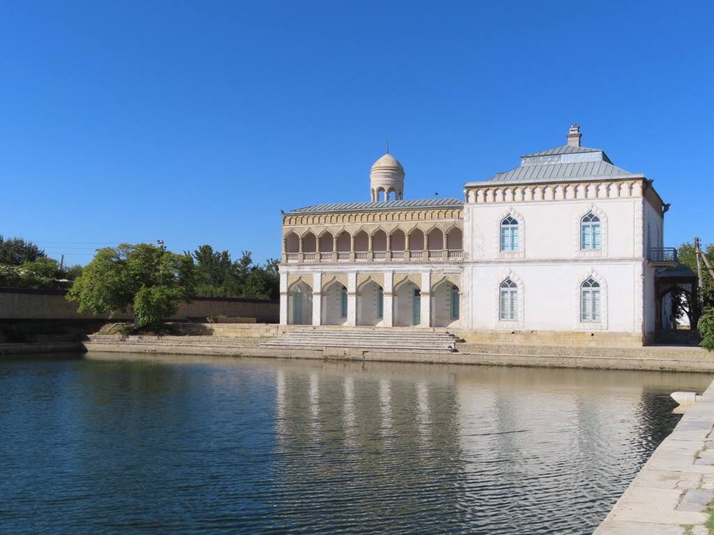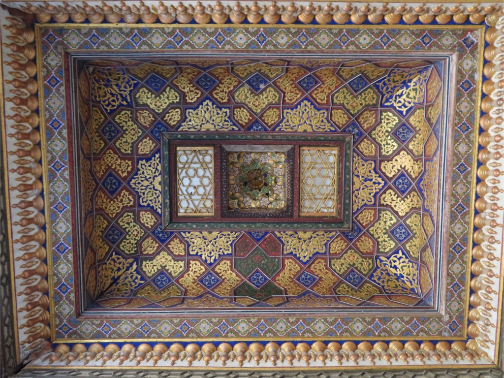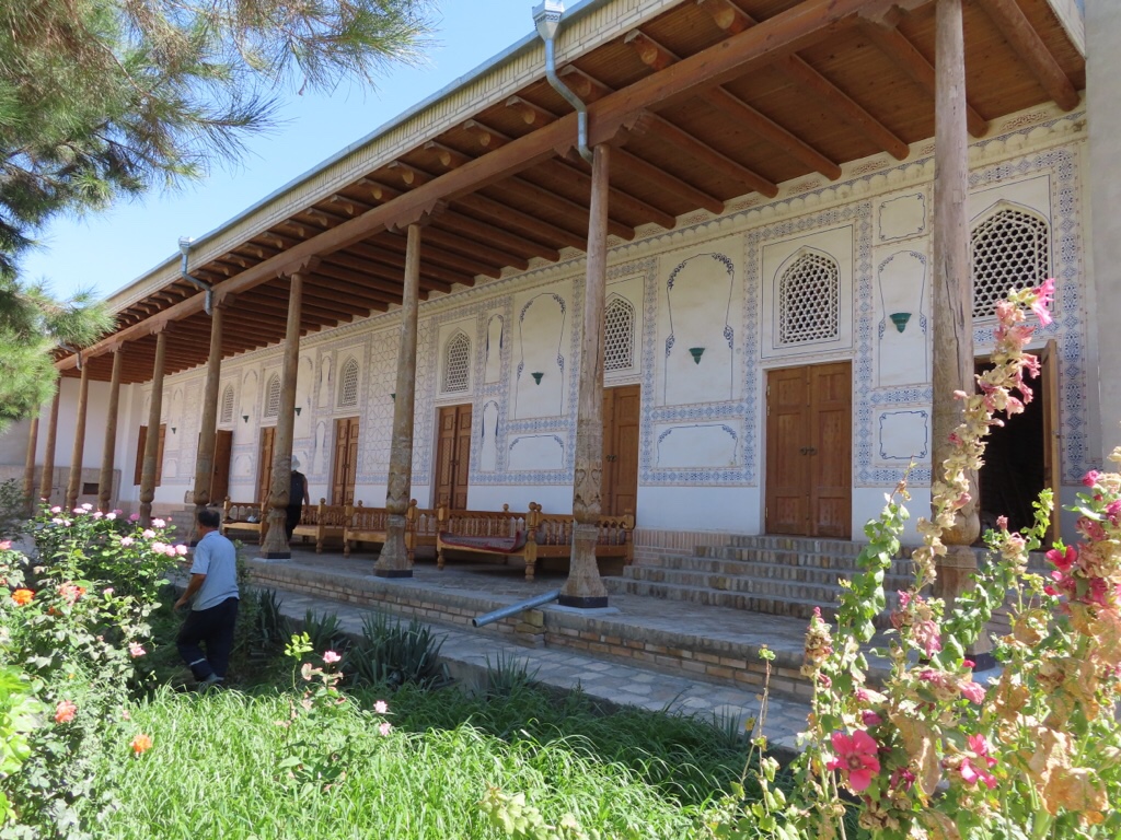 Sitorai Mokhi-Khosa Palace was the countryside residence of Bukhara emirs, now just on the outskirts of the city. The location is always cool, and was chosen by an ancient method of putting sheep carcasses at the likely construction sites and opting for the one with least decomposition. The original building from the mid C19th was replaced some years later by another emir, Muzaffar-Khan who devoted the palace to his wife Sitora. When she died, it was named Sitorai Mokhi-Khosa, translated from Tajik as ‘Star-like, Moon-like Palace’ but most existing buildings were completed in 1918 for the last emir of Bukhara, Alim Khan by the best Bukhara masters of the time.