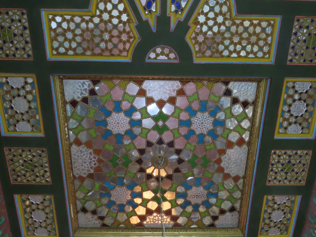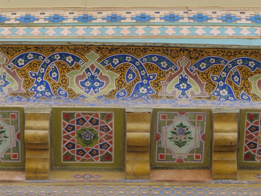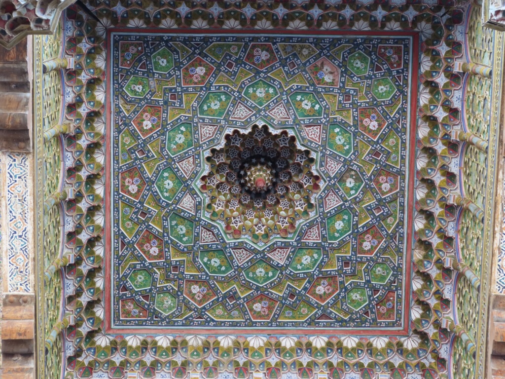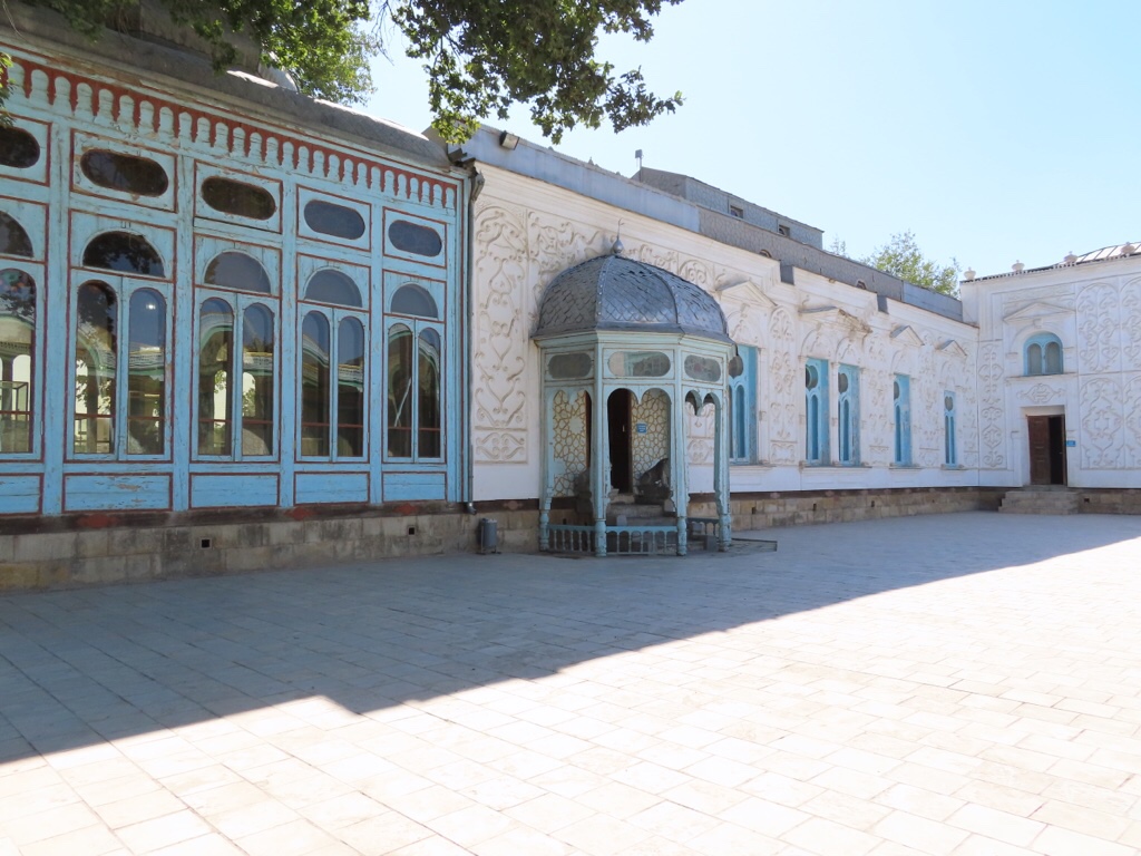 Sitorai Mokhi-Khosa Palace was the countryside residence of Bukhara emirs, now just on the outskirts of the city. The location is always cool, and was chosen by an ancient method of putting sheep carcasses at the likely construction sites and opting for the one with least decomposition. The original building from the mid C19th was replaced some years later by another emir, Muzaffar-Khan who devoted the palace to his wife Sitora. When she died, it was named Sitorai Mokhi-Khosa, translated from Tajik as ‘Star-like, Moon-like Palace’ but most existing buildings were completed in 1918 for the last emir of Bukhara, Alim Khan by the best Bukhara masters of the time.