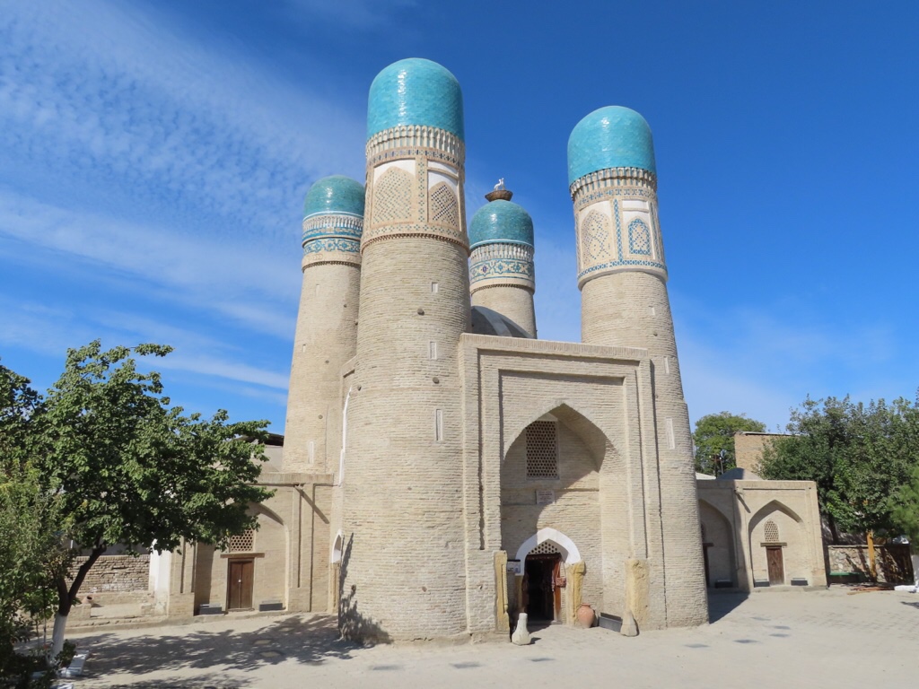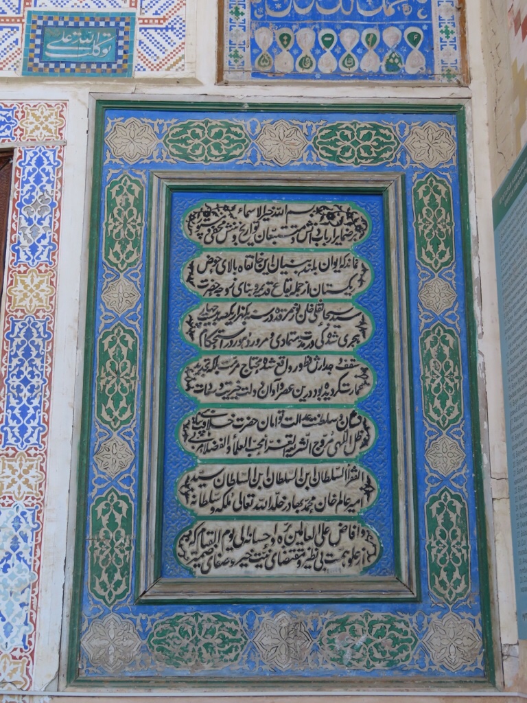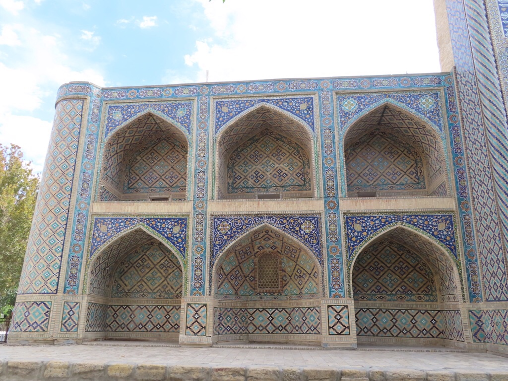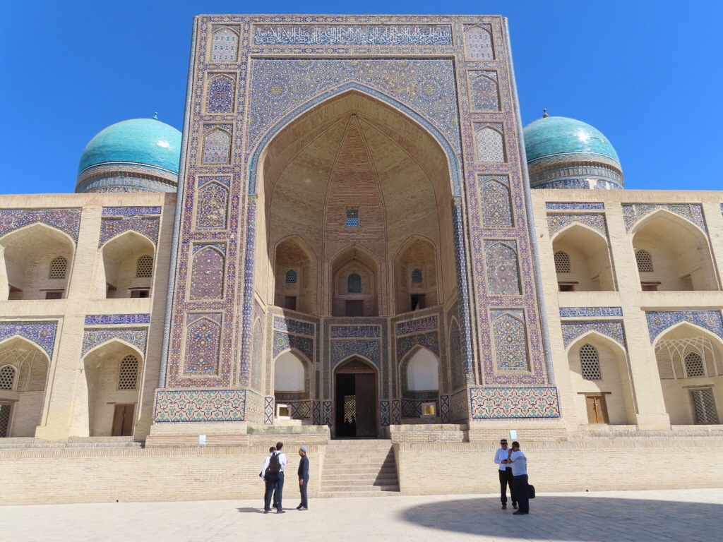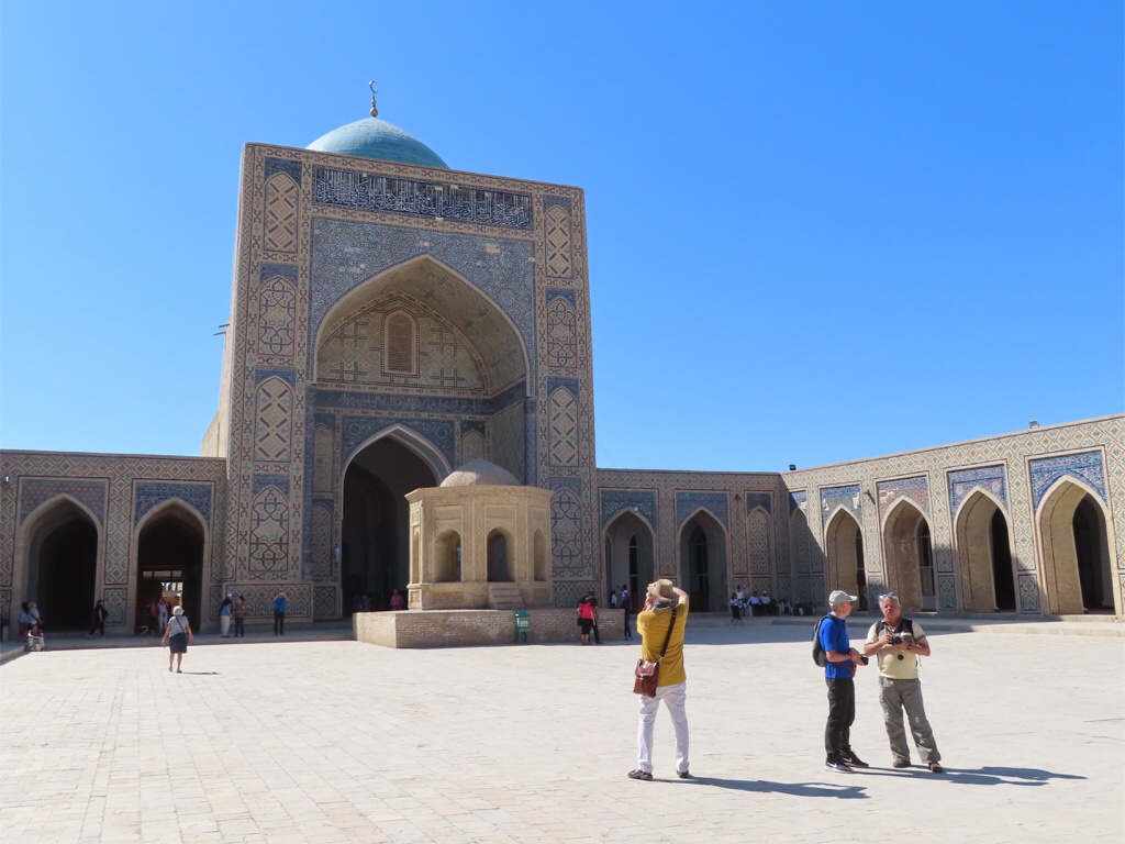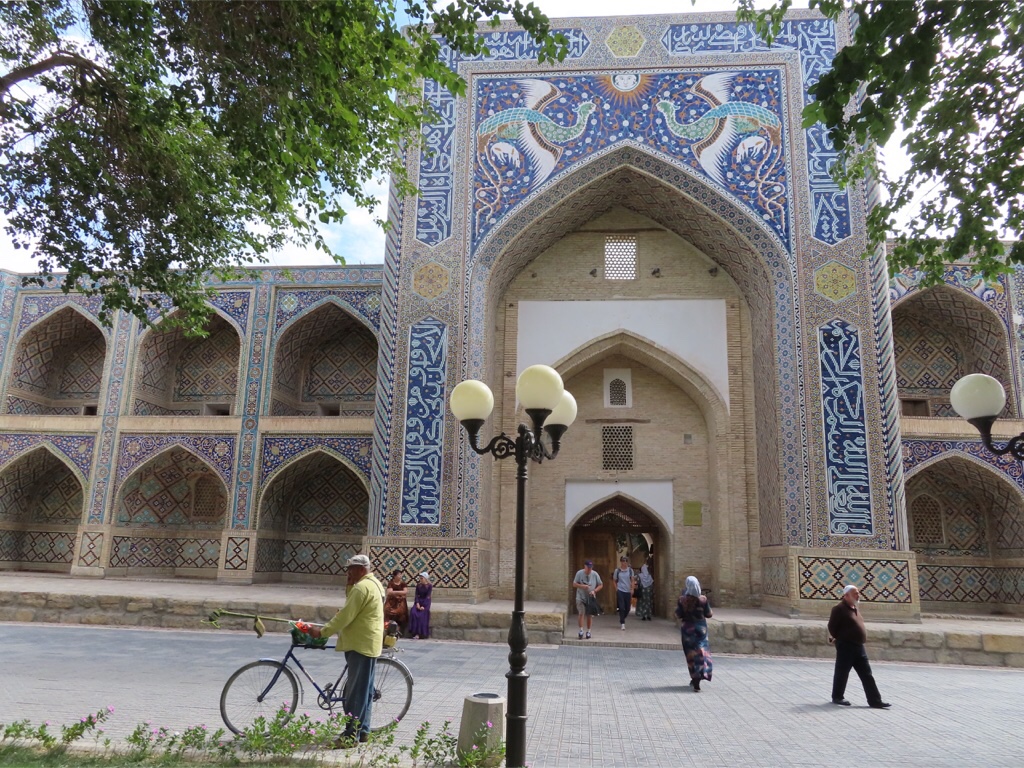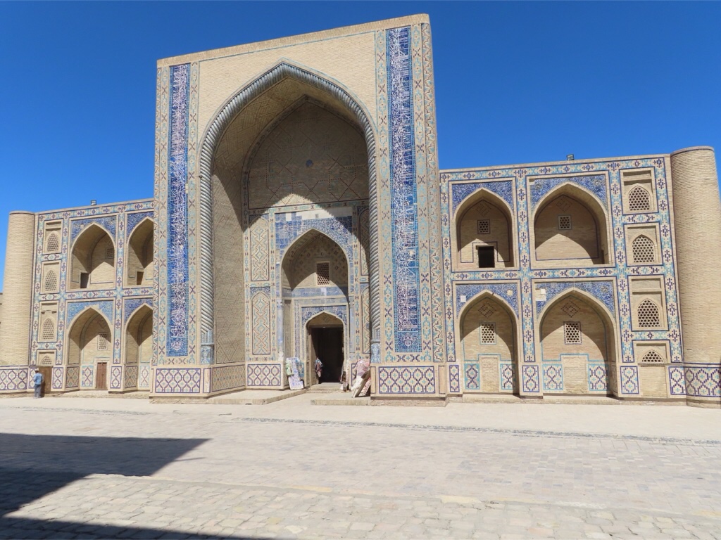 Our next stop was a pair of facing madrasas built over two centuries apart. Ulugh Beg Madrasa was constructed in 1419, the work of Ulugh Beg, the astronomer-king and grandson of Timur. It represented the first stirrings of Bukhara’s cultural rebirth, as the madrasa served as a magnet to attract scholars and scientists from across the Muslim world, eager to advance both piety and knowledge. A corded band decorates the gateway and the calligraphic inscription ‘Aspiration to knowledge is the duty of every Muslim man and woman’.