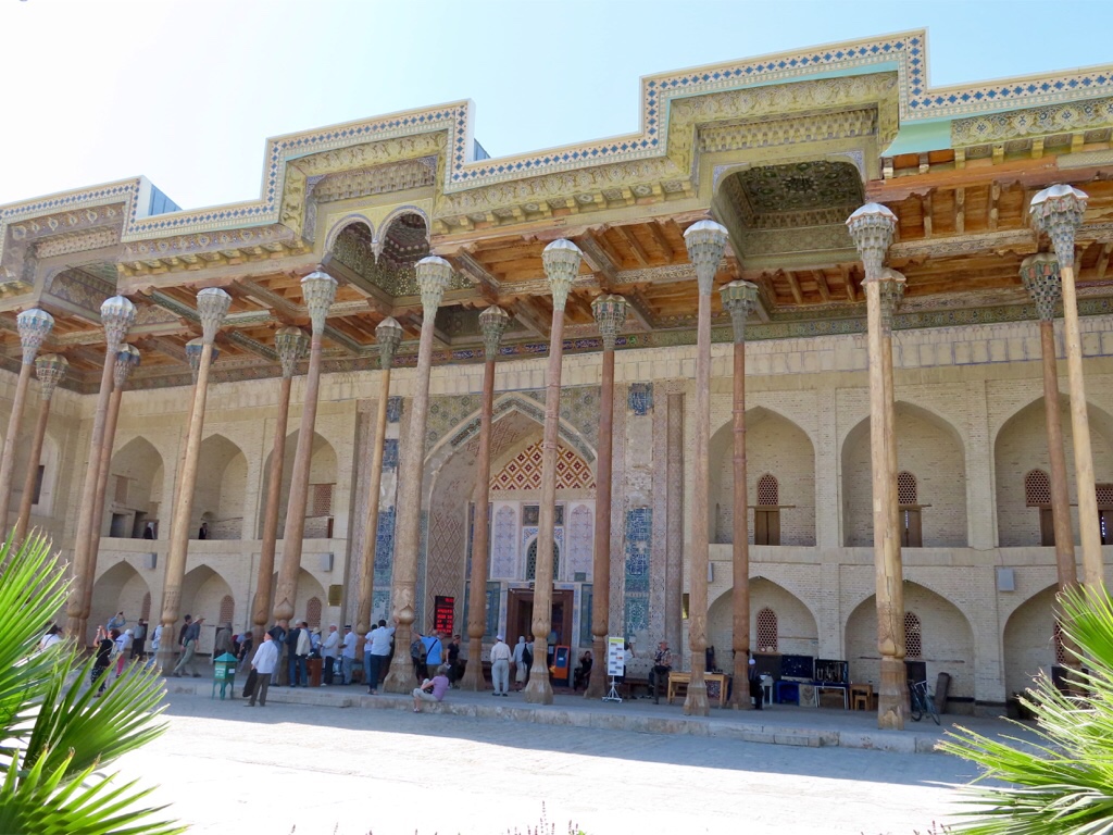 A short way west is the main central square or Registan of Bukhara. There were once a lot of public buildings here, but all that remains is the Bolo-Khauz Mosque which was built in 1712 by Emir Shahmurad who wanted to attend Friday prayers with the people. It is named for the far older hauz or pool in front. The irwan has a wooden ceiling leaning on refined columns and is decorated with fretwork and ornamented with floral and geometrical ornamental patterns. A short minaret was built in 1917.