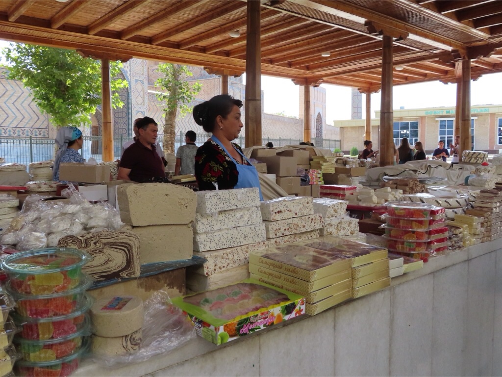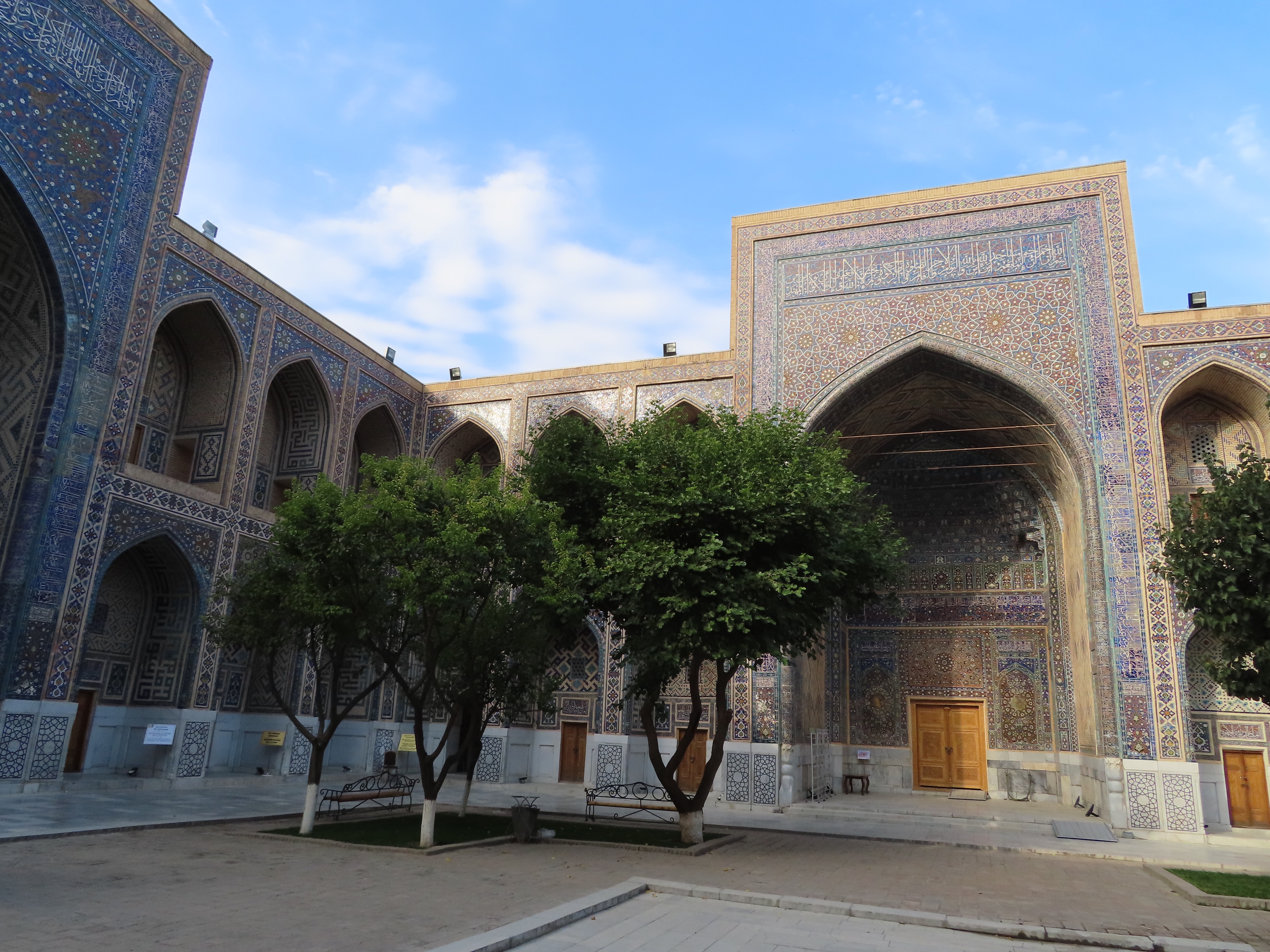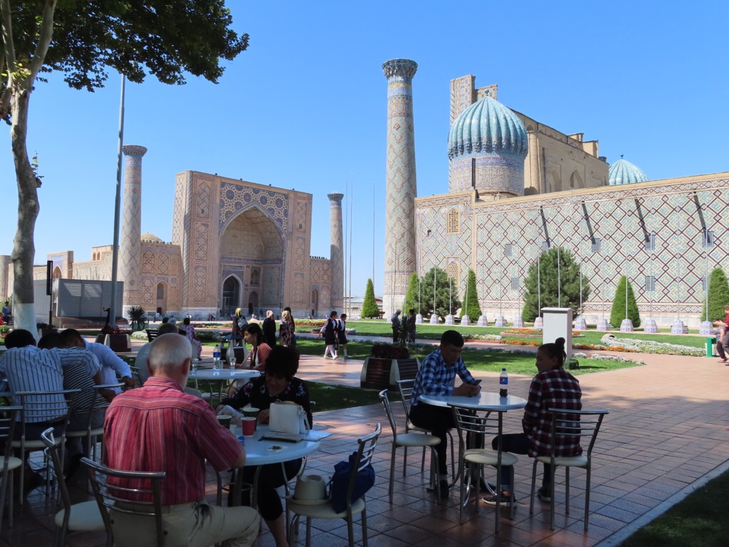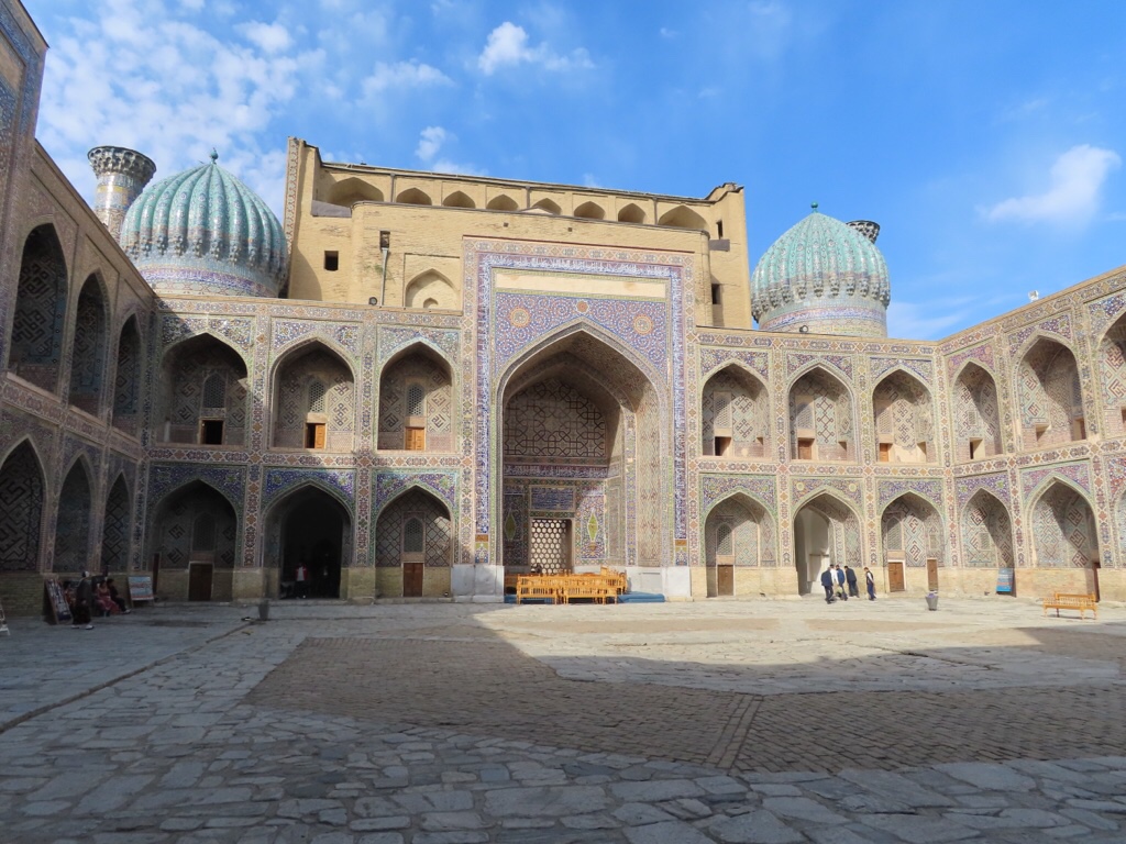 Just a few steps took us to the C16th Kukeldash Madrassah, once the largest Islamic school in Central Asia but looking a little rundown apart from some souvenir shops …