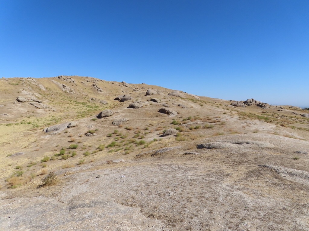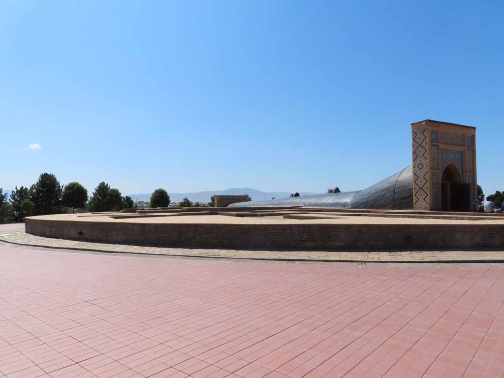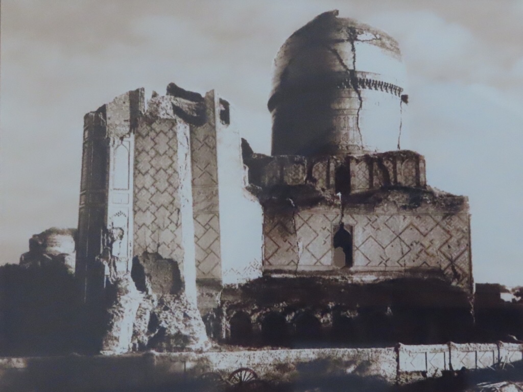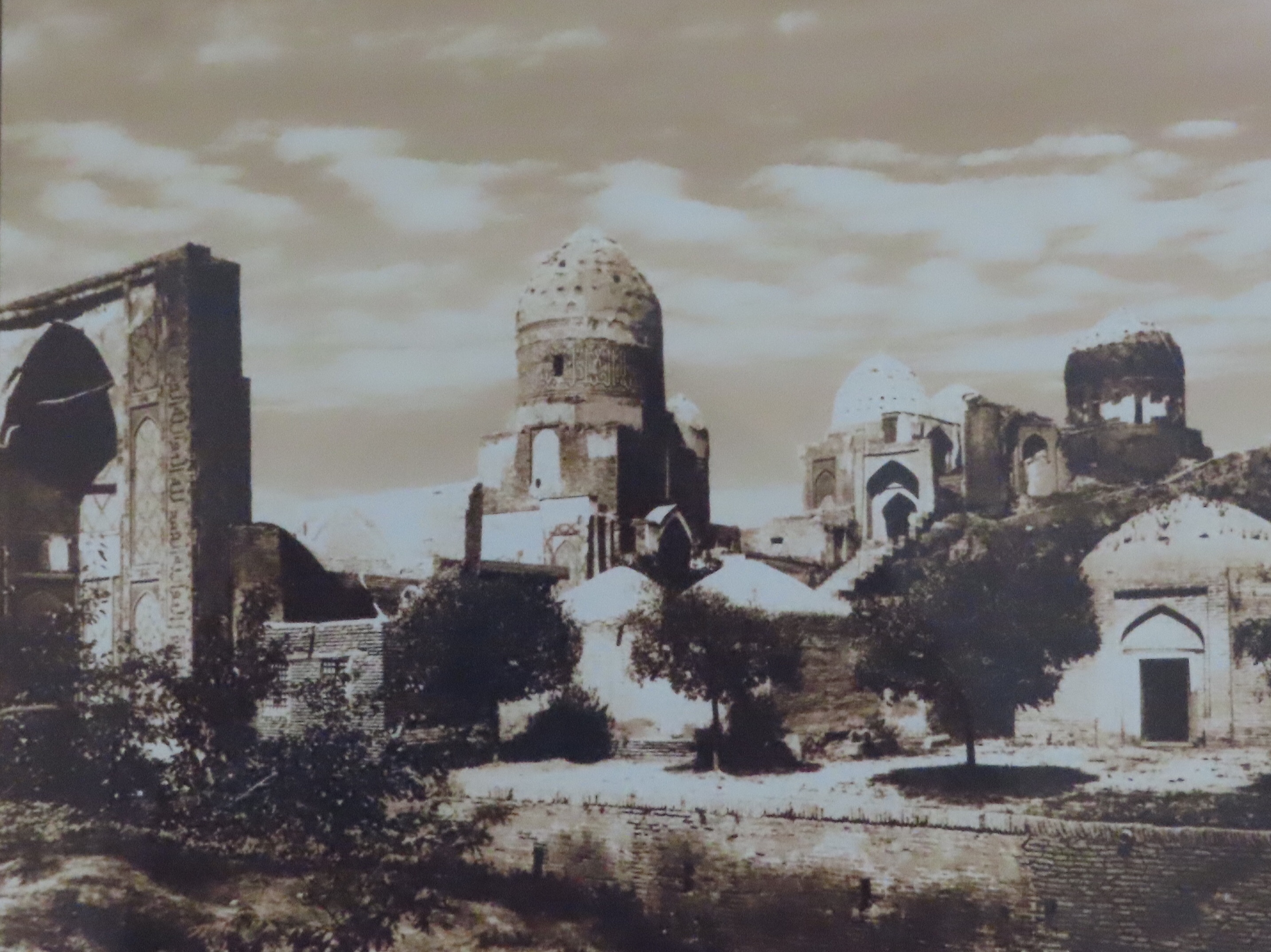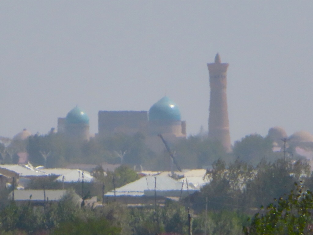 The Chor-Bakr Necropolis was built in the C16th, although it was already established as a burial ground. The main complex has two mosques, pool and later minaret. We went up on the roof for views … including this rather Impressionist snap of the Kalyan complex in the distance.