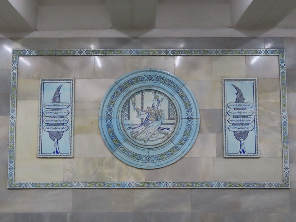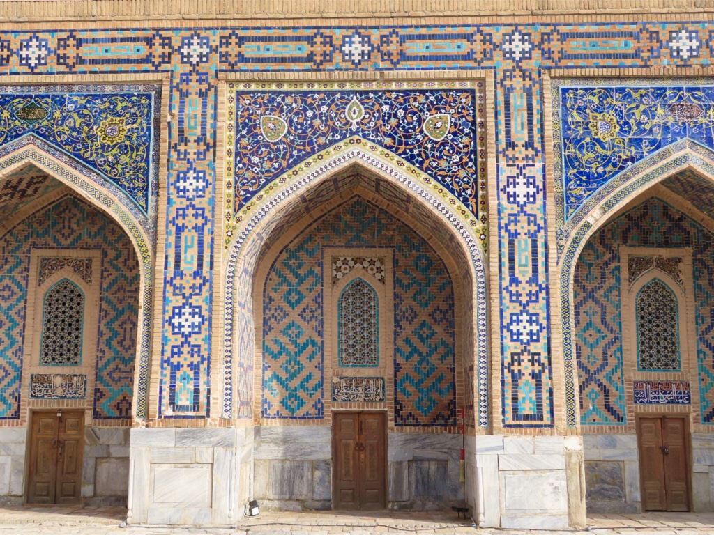 The Mir-i Arab Madrasa opposite was constructed in 1536, also by Ubaydullah-khan, funded by the sale of 3,000 slaves captured in his wars in Khorasan. The two-story facade is almost completely covered in glazed mosaic faience tiles, a time-consuming and expensive decorative treatment that was first popularized under Timur’s rule.