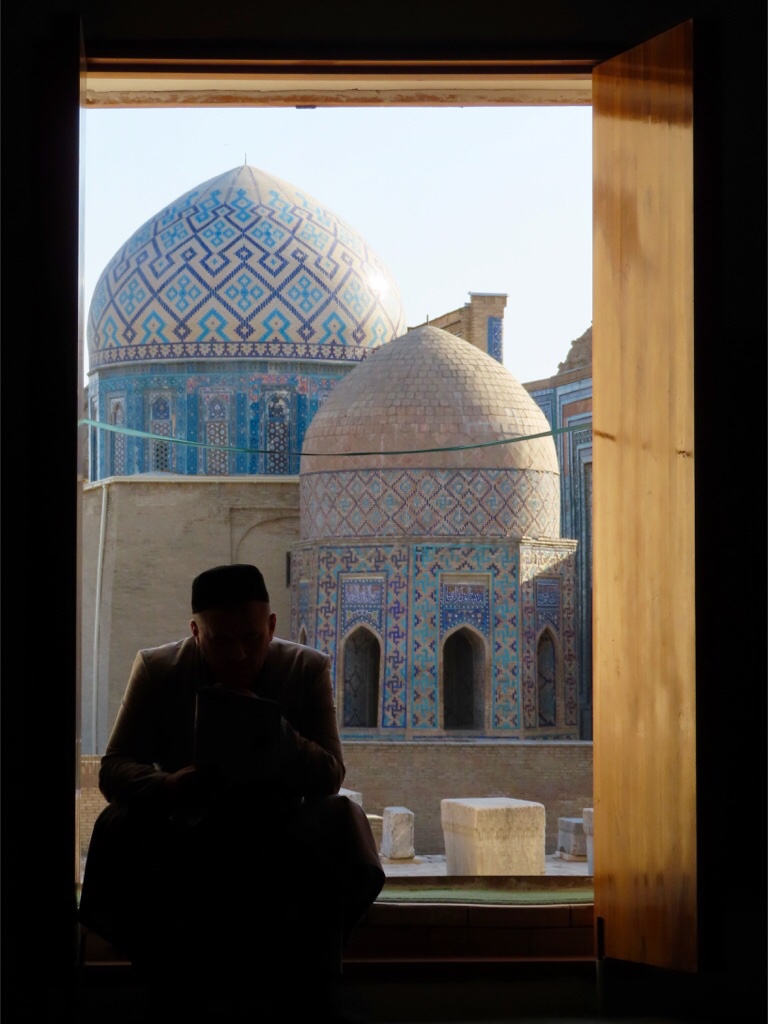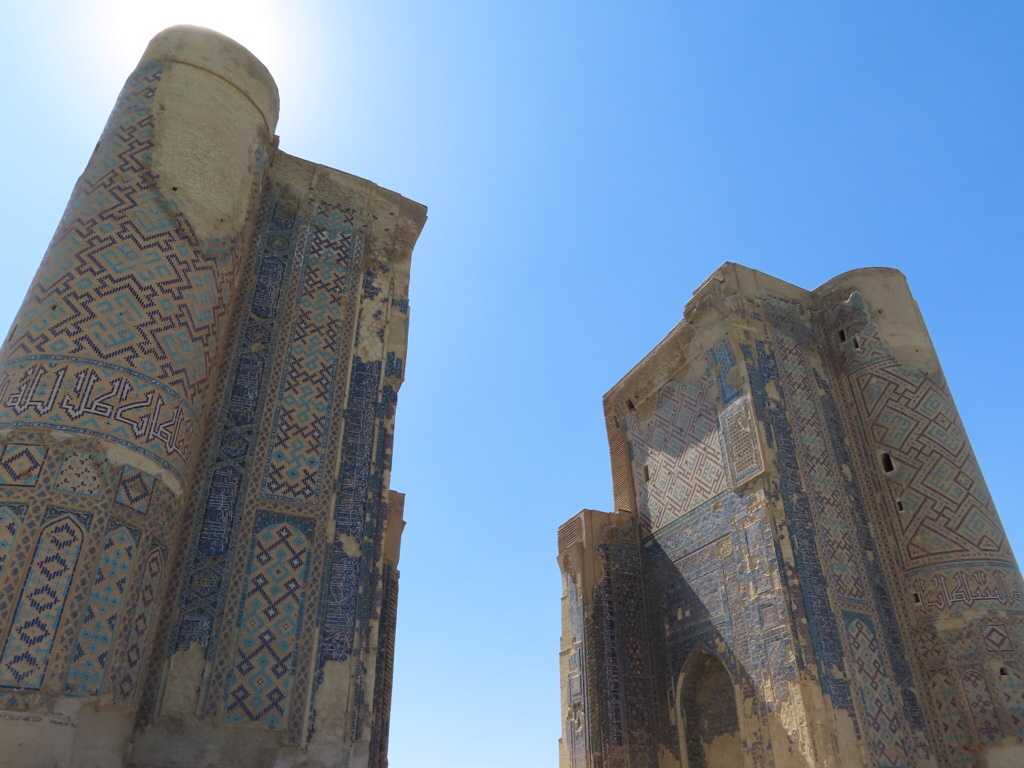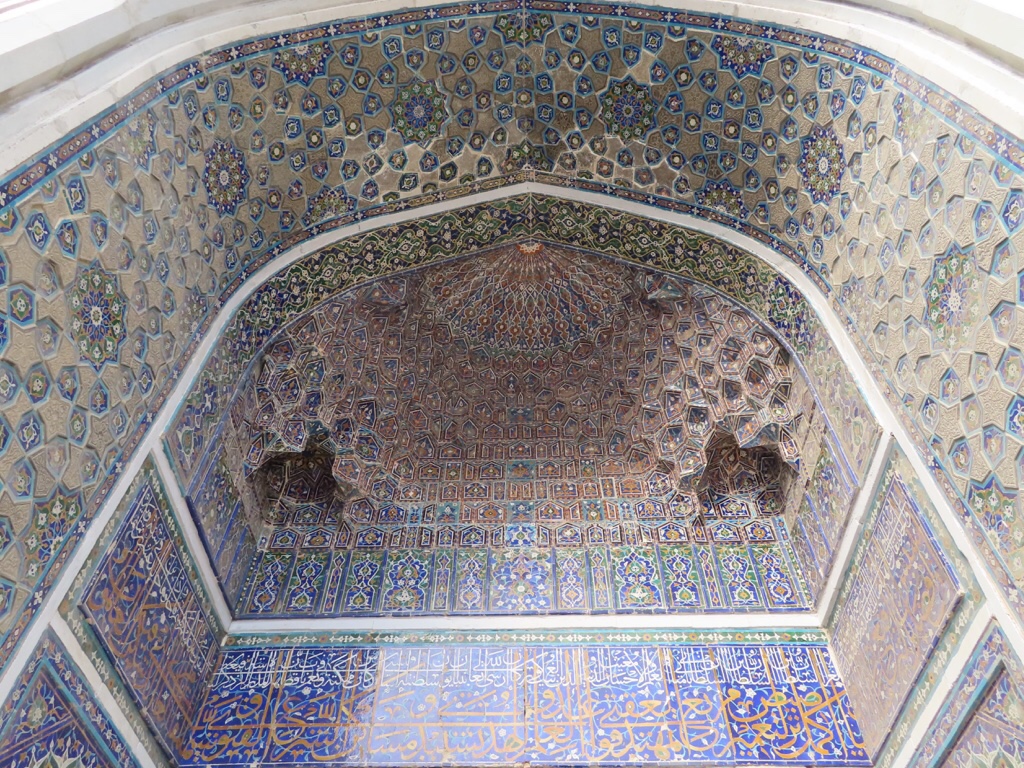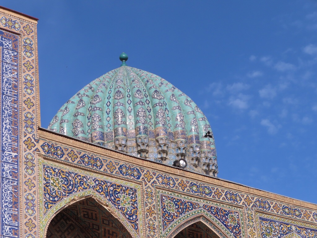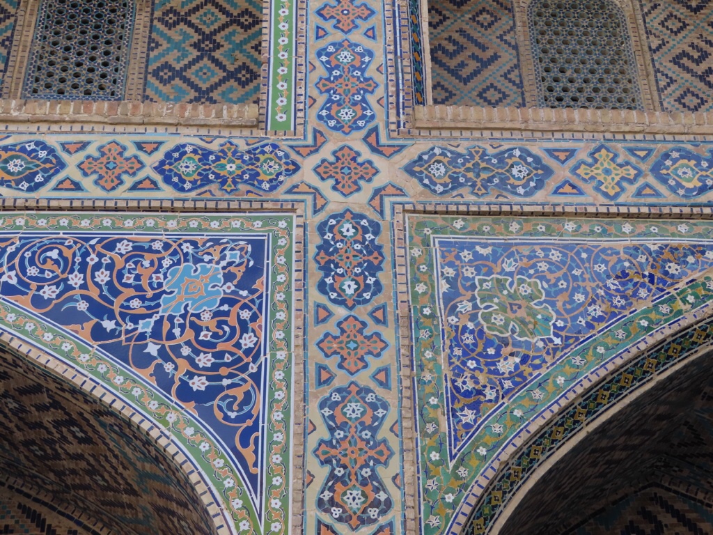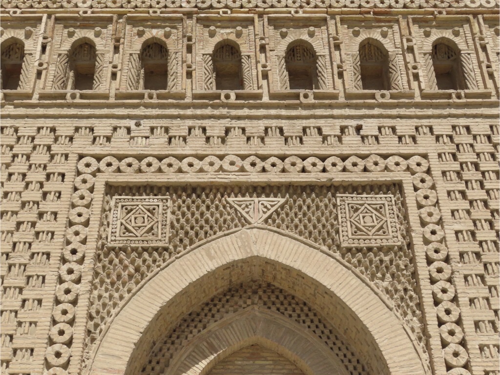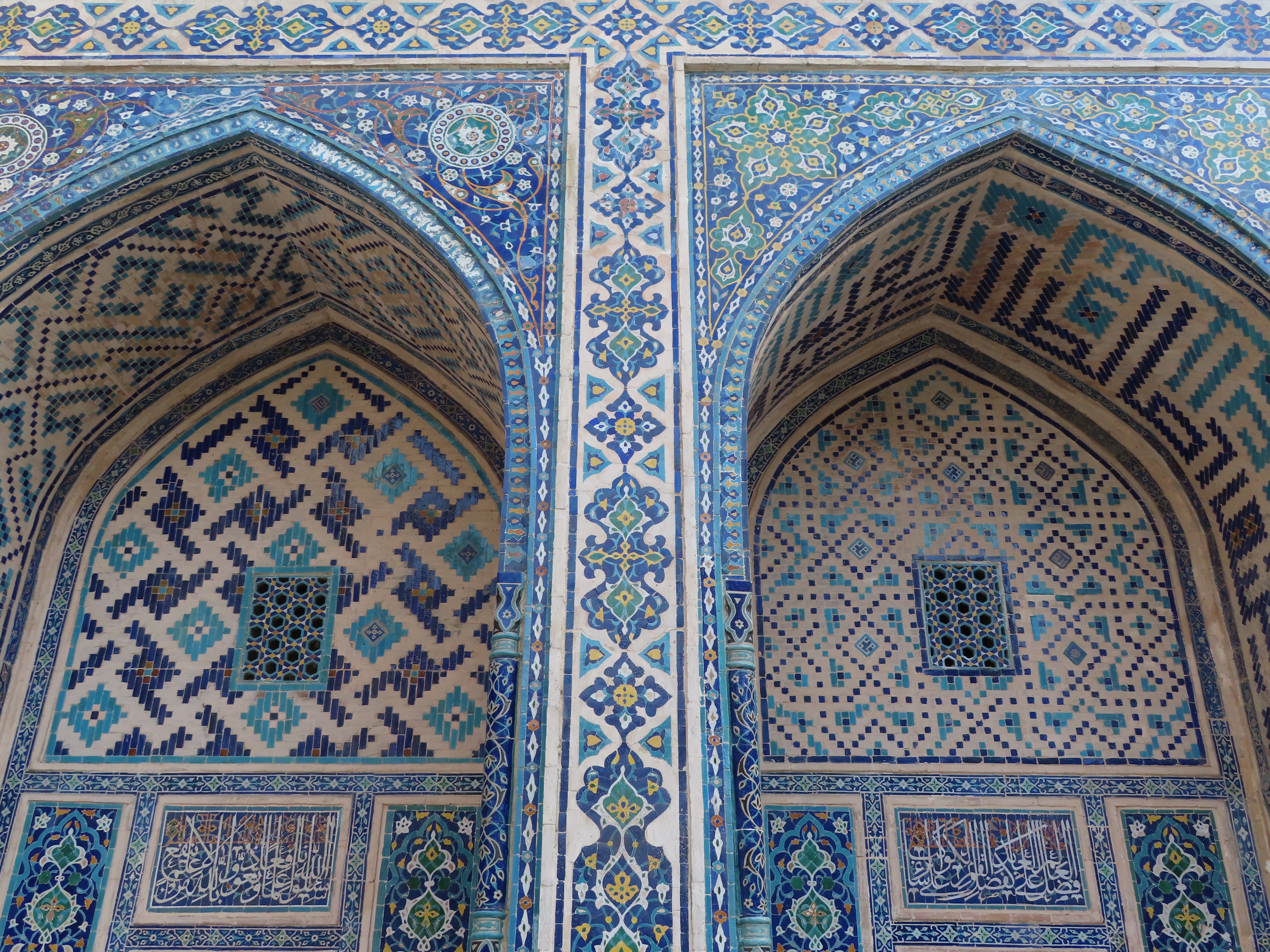 Our next stop was a pair of facing madrasas built over two centuries apart. Ulugh Beg Madrasa was constructed in 1419, the work of Ulugh Beg, the astronomer-king and grandson of Timur. It represented the first stirrings of Bukhara’s cultural rebirth, as the madrasa served as a magnet to attract scholars and scientists from across the Muslim world, eager to advance both piety and knowledge. A corded band decorates the gateway and the calligraphic inscription ‘Aspiration to knowledge is the duty of every Muslim man and woman’.