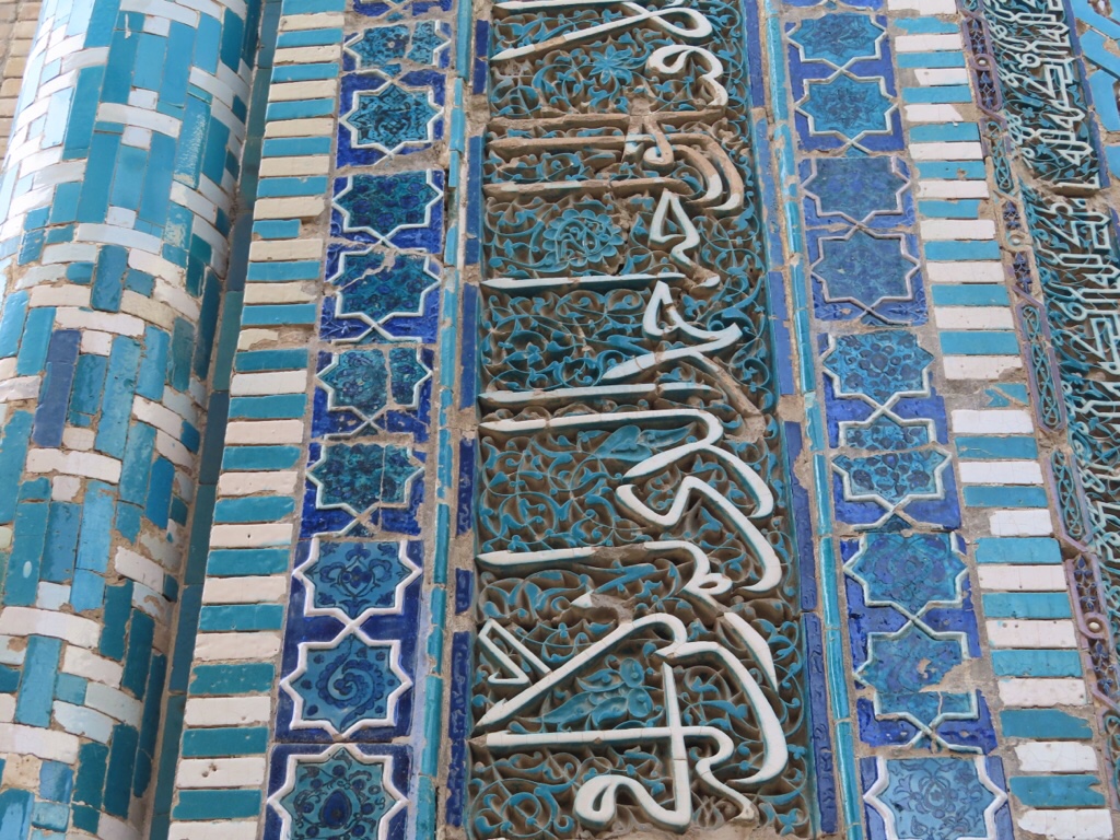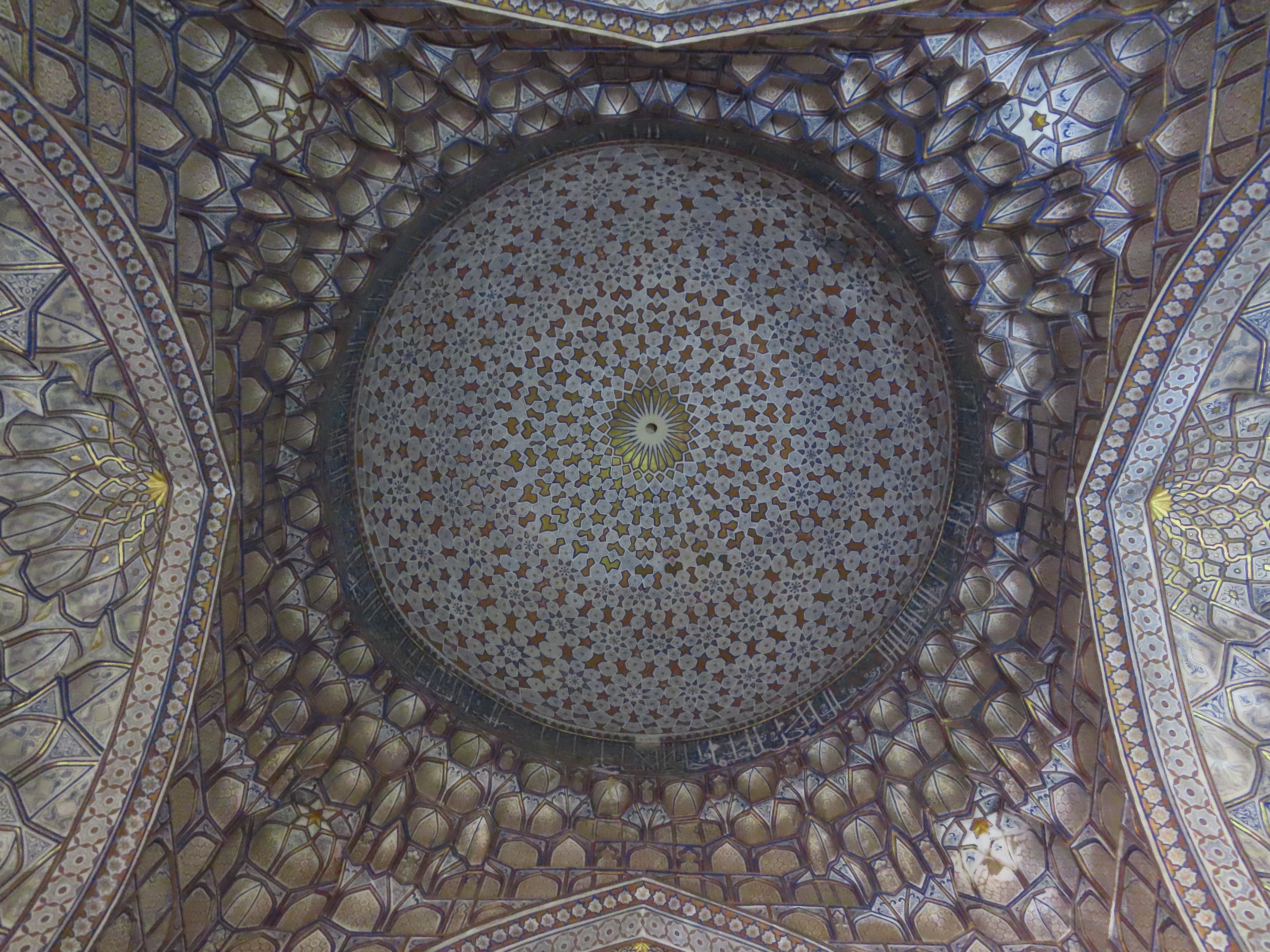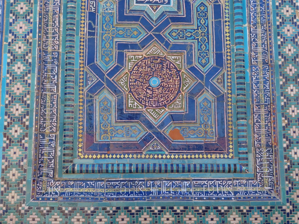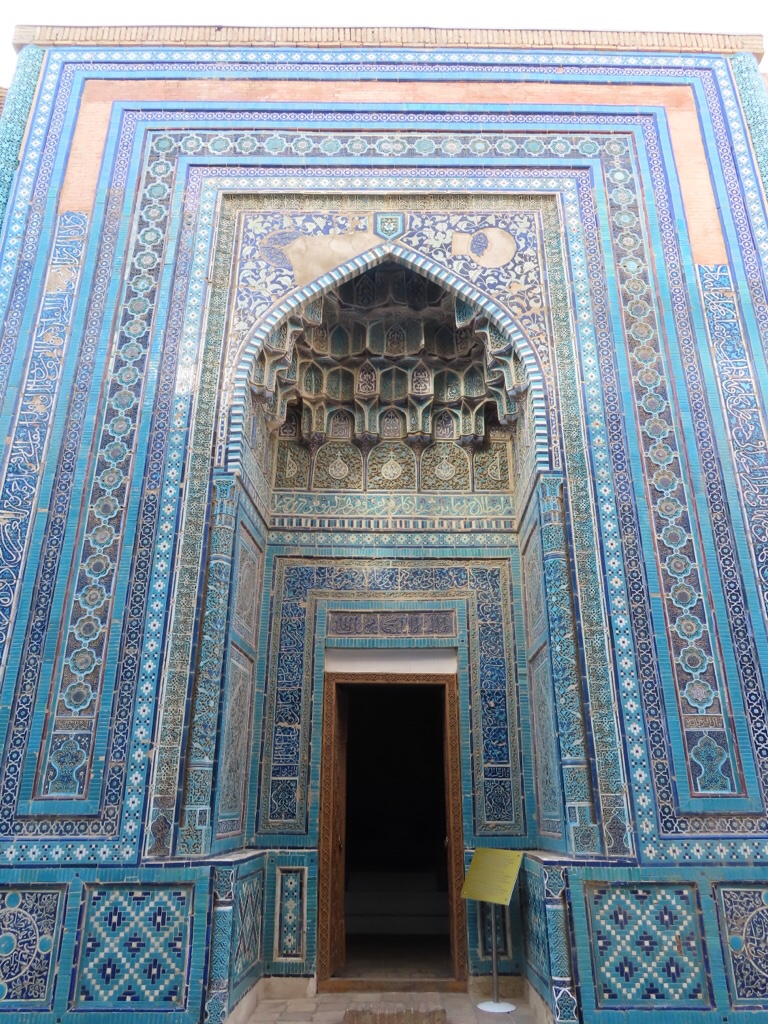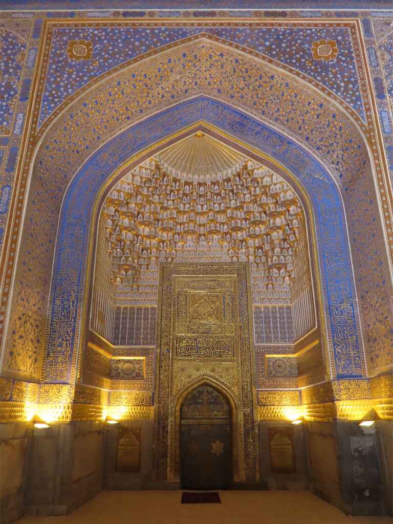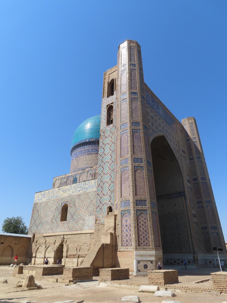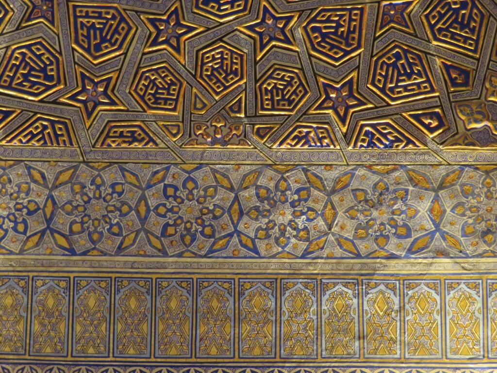 Our next stop was a pair of facing madrasas built over two centuries apart. Ulugh Beg Madrasa was constructed in 1419, the work of Ulugh Beg, the astronomer-king and grandson of Timur. It represented the first stirrings of Bukhara’s cultural rebirth, as the madrasa served as a magnet to attract scholars and scientists from across the Muslim world, eager to advance both piety and knowledge. A corded band decorates the gateway and the calligraphic inscription ‘Aspiration to knowledge is the duty of every Muslim man and woman’.