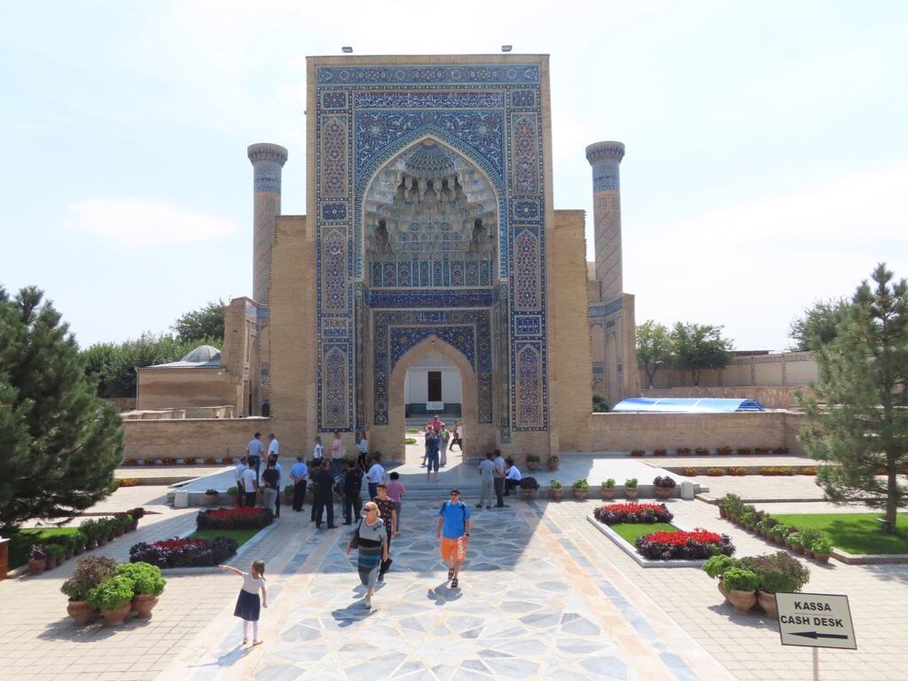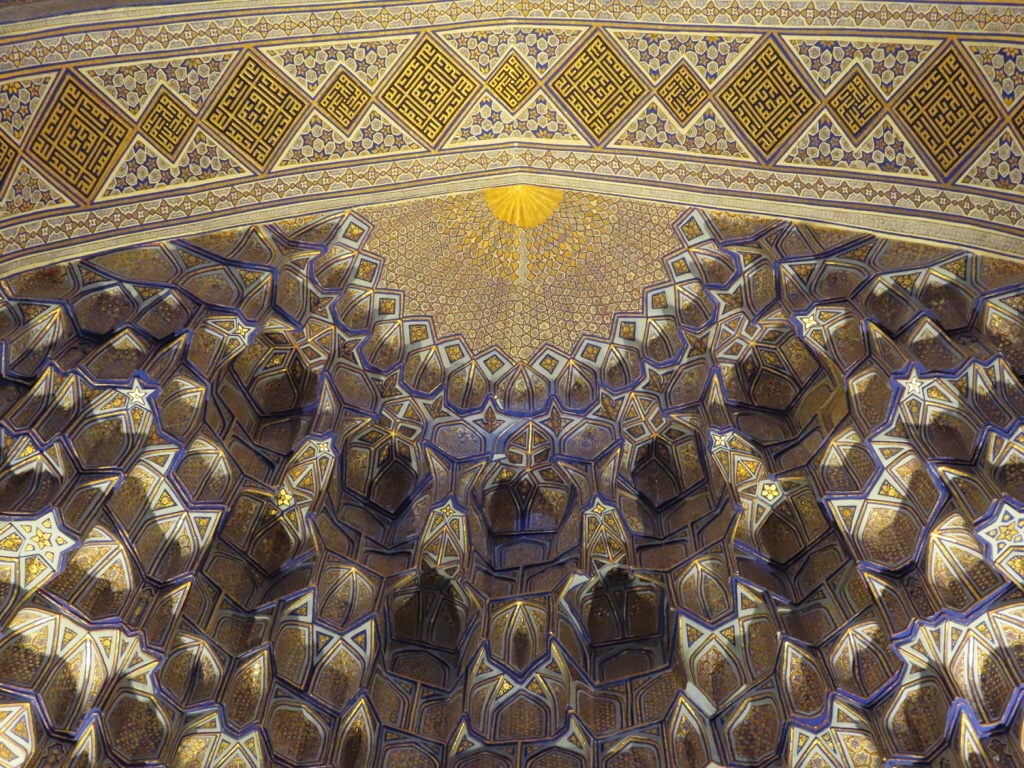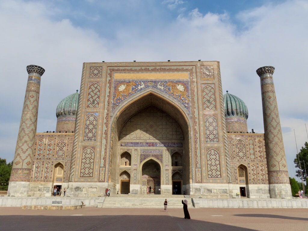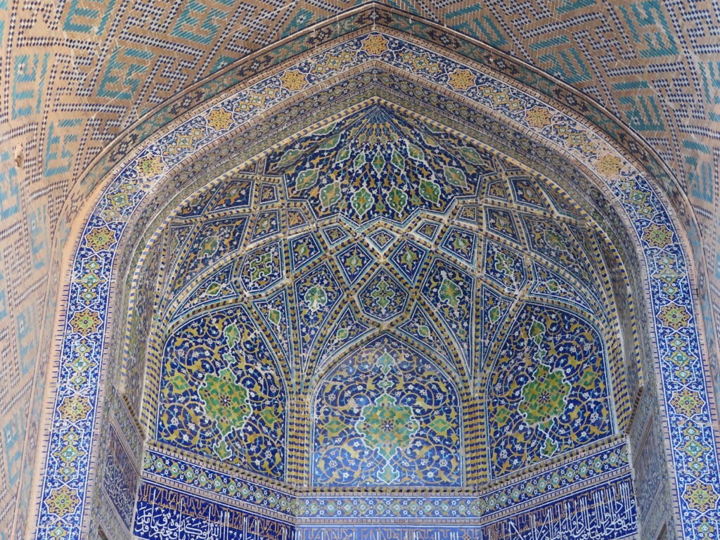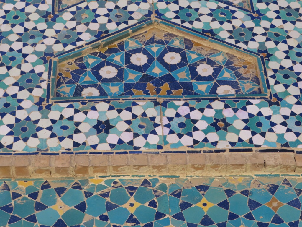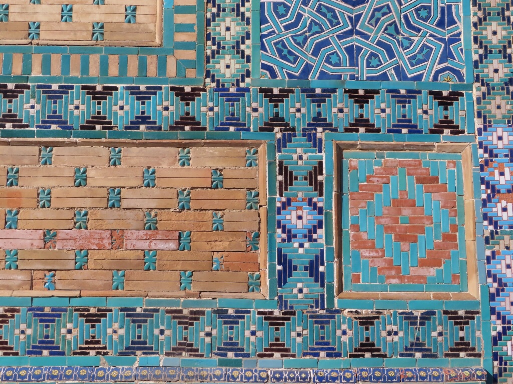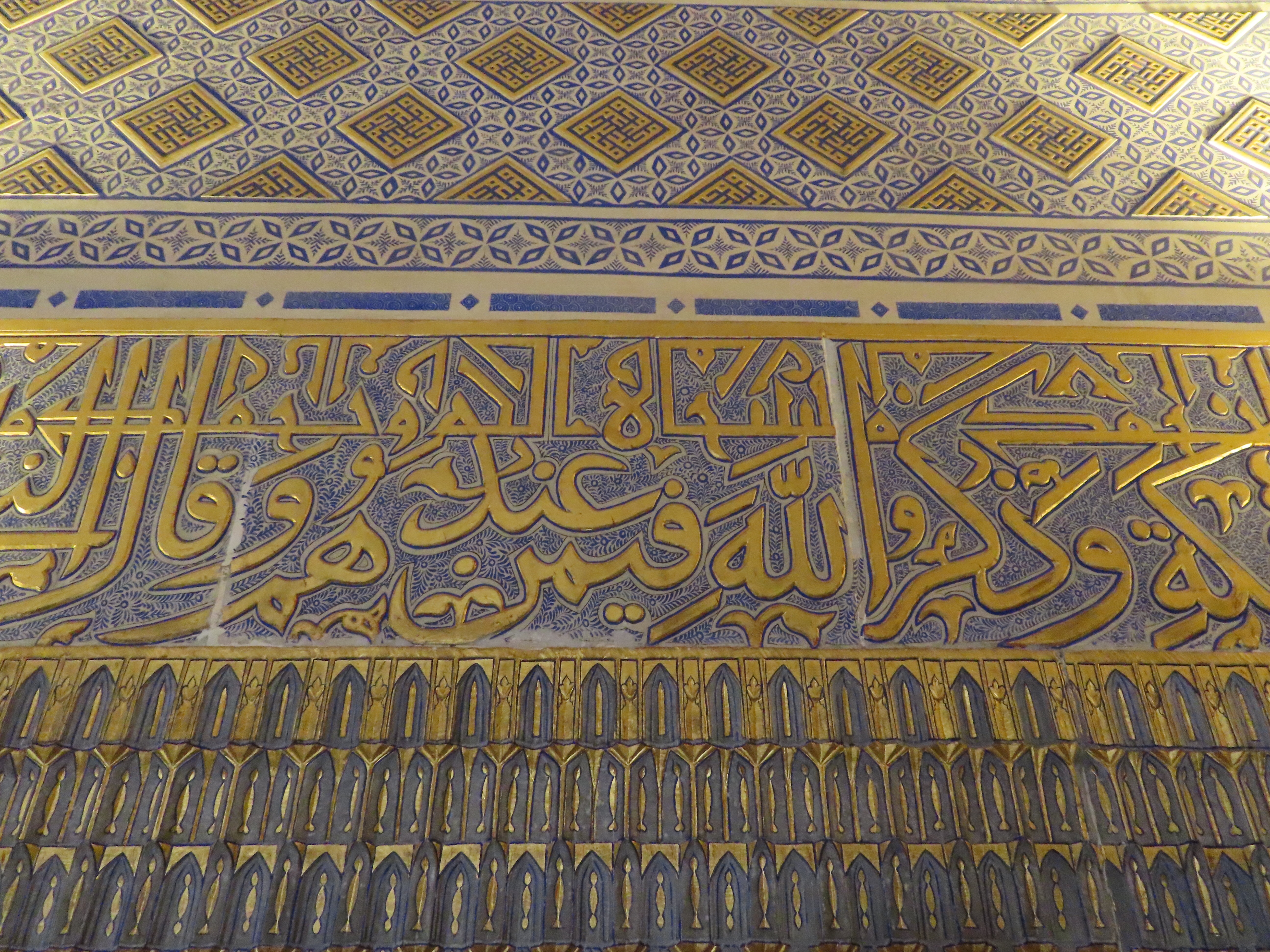 Our next stop was a pair of facing madrasas built over two centuries apart. Ulugh Beg Madrasa was constructed in 1419, the work of Ulugh Beg, the astronomer-king and grandson of Timur. It represented the first stirrings of Bukhara’s cultural rebirth, as the madrasa served as a magnet to attract scholars and scientists from across the Muslim world, eager to advance both piety and knowledge. A corded band decorates the gateway and the calligraphic inscription ‘Aspiration to knowledge is the duty of every Muslim man and woman’.
