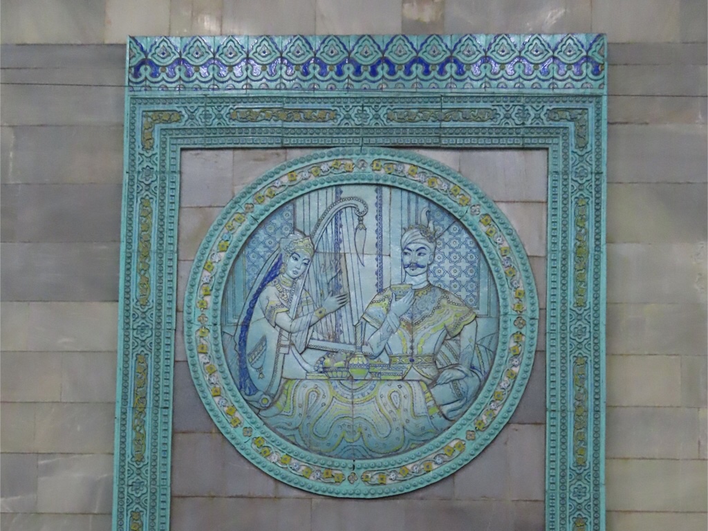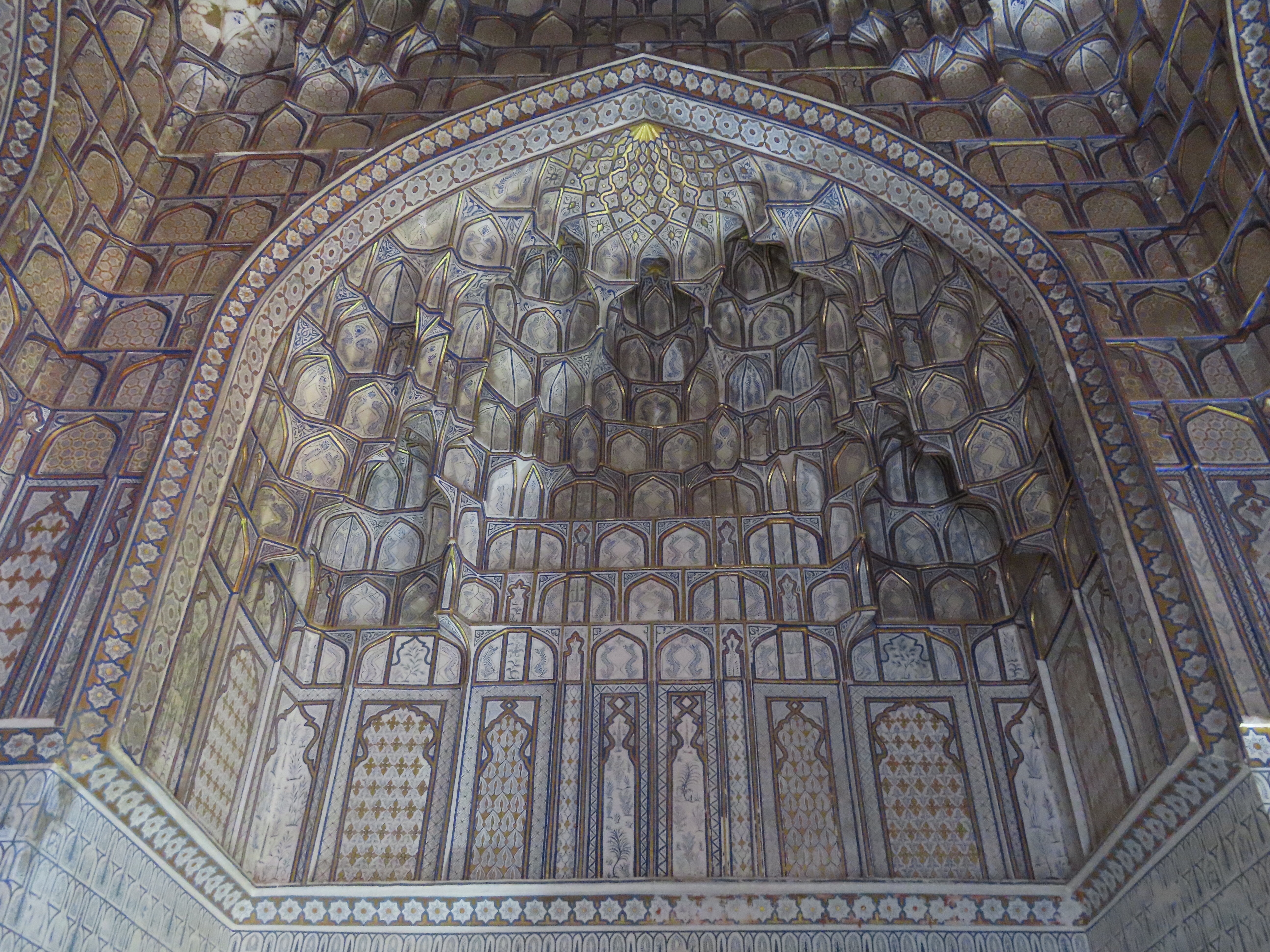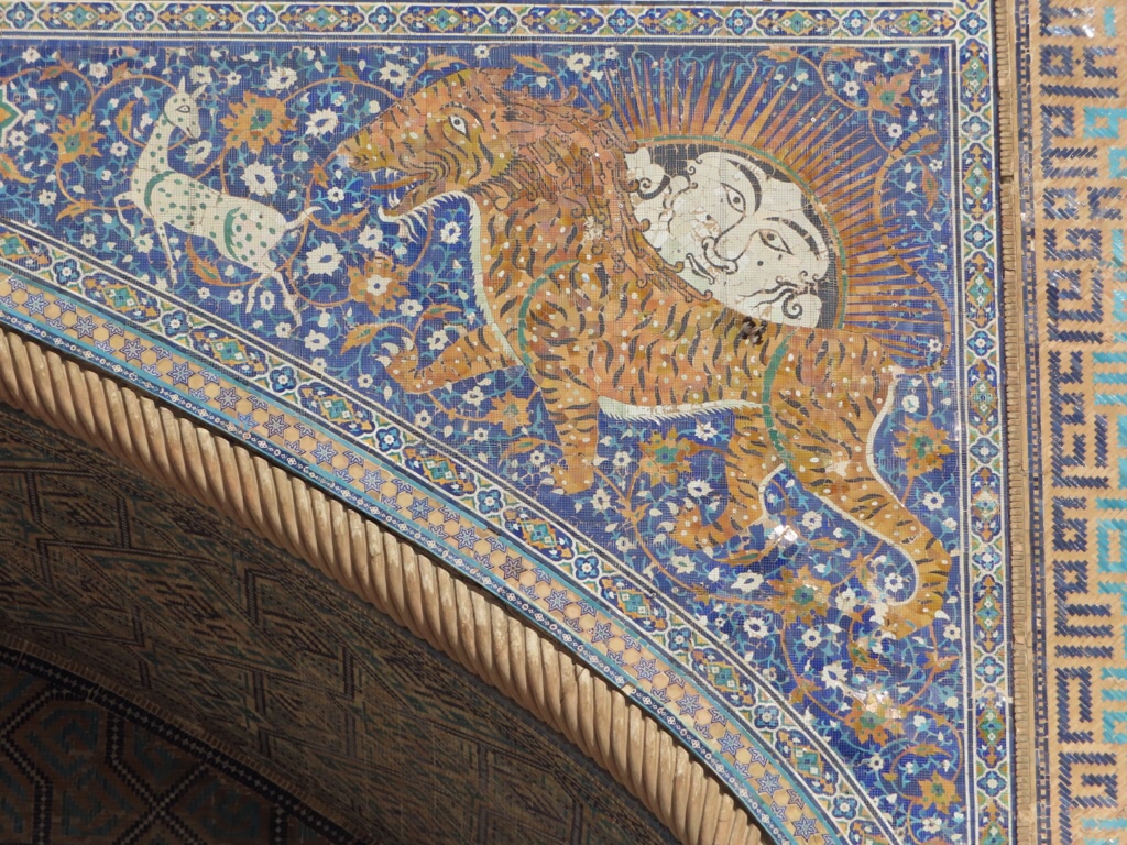 The construction of two monumental buildings facing one another was a common practice in central Asian cities and was known as kosh, and we will see it several times in Bukhara alone. Traditionally, Islam discouraged the depiction of human and animal forms in case it lead to idolatry but in the early C17th under the Shaybanids the rule was not so strictly enforced and here there are mosaics of fantastical birds and a sun with a human face.