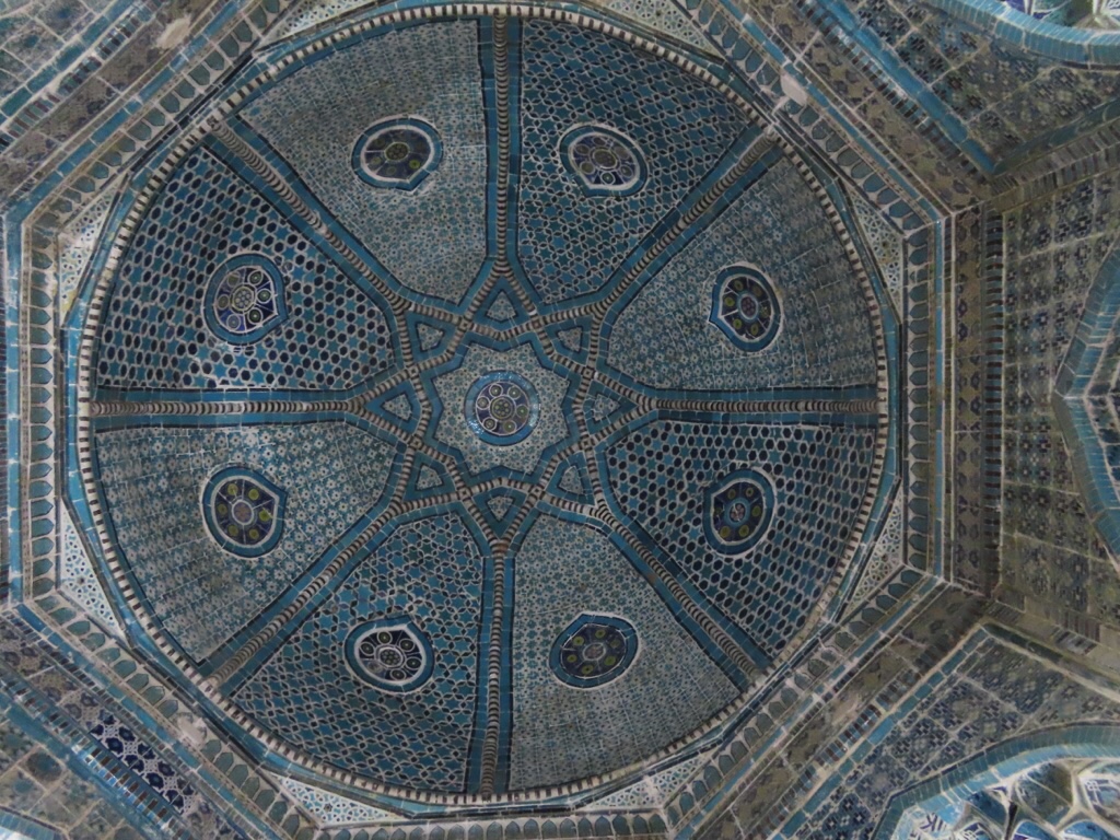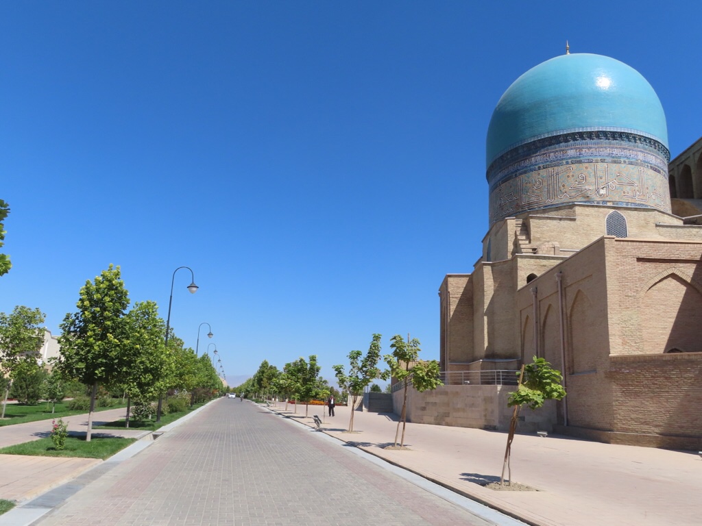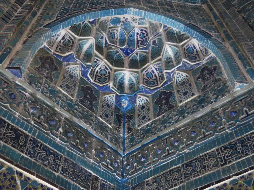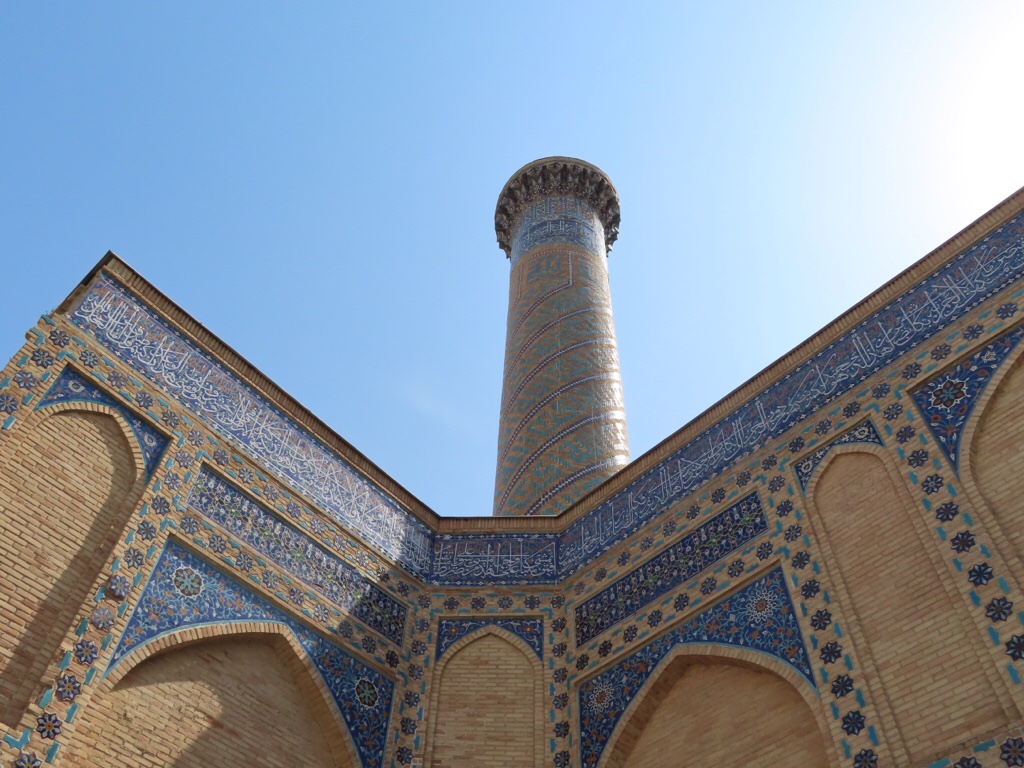The Khoja Gaukushan Ensemble was built by the Juabari family in the C16th and is rare as it remains untouched by later redevelopment. Gaukushan refers to the slaughter of cattle so there might once have been an abattoir here. It is on the junction of two medieval streets and the Shah Rud canal, it comprises a mosque, a minaret, two madrasas and a hauz which is a pond.