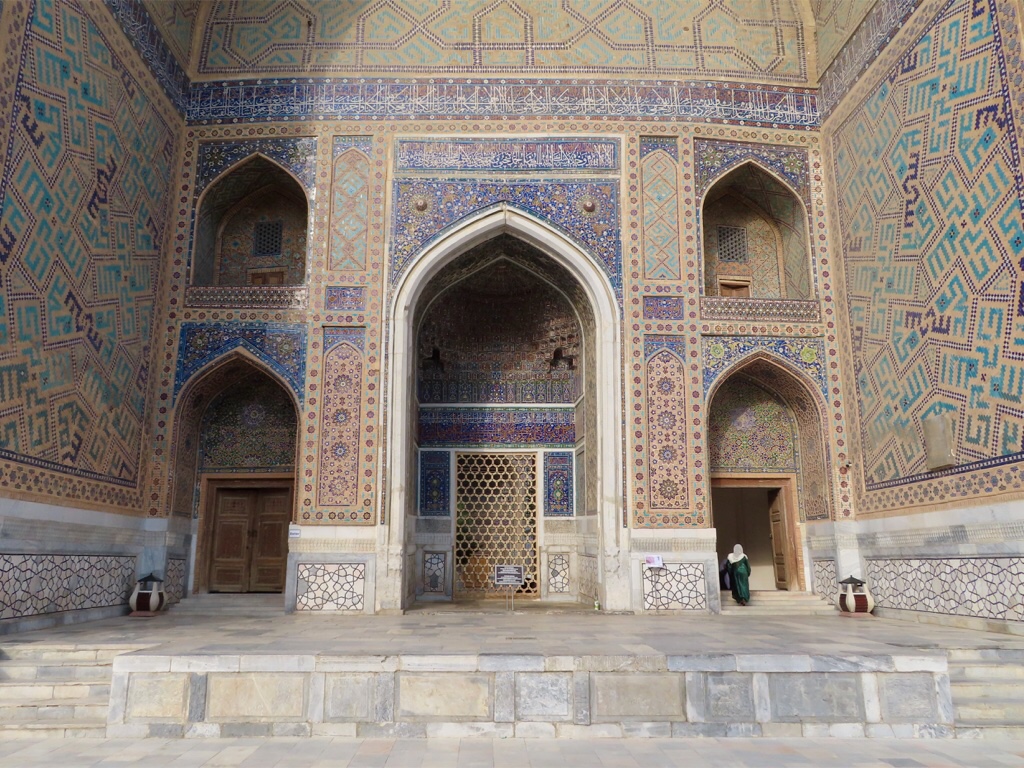 Opposite, the Abdullazizkhan Madrasa built in 1652 shows the progress of medieval Central Asian architecture. The gateway here is adorned with facets and ornamental stalactites patterned with bright floral designs and colours and even gilding.