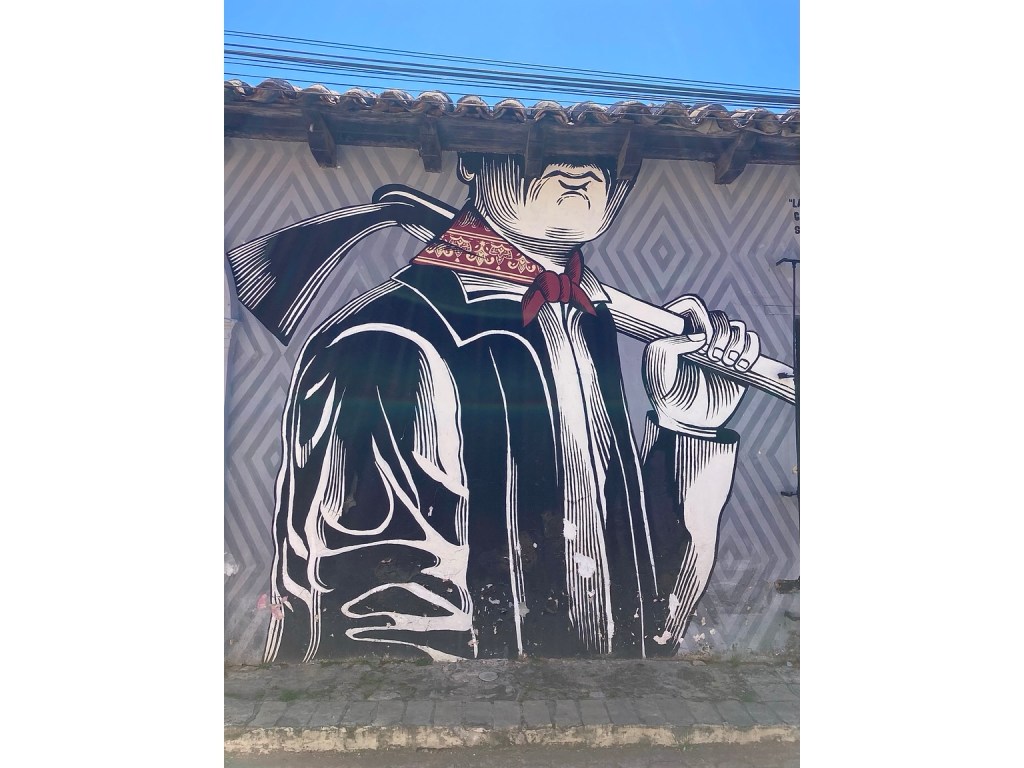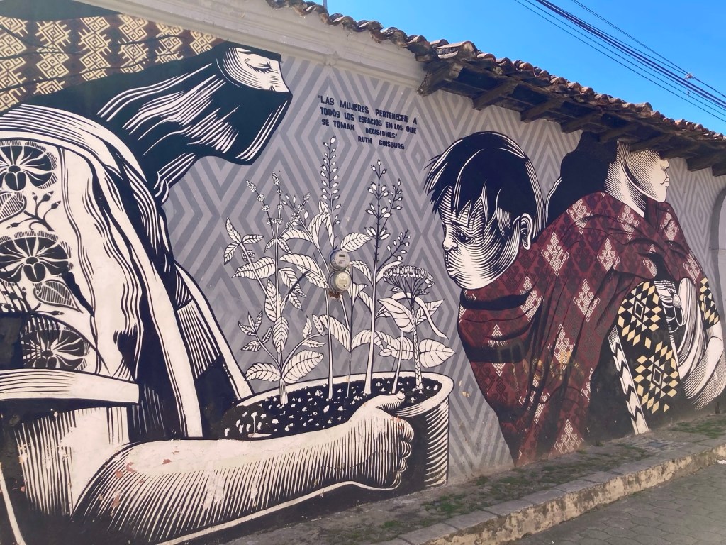She mentioned the Zapatista uprising in Chiapas in 1994 led by indigenous people demanding equal rights. Several municipal capitals were taken, including San Cristóbal and after 12 days, civil pressure led to a ceasefire. Subsequently, indigenous rights were recognised in the Constitution, but indigenous people still don’t have proper access to education and without even being able to speak Spanish, are obviously at a disadvantage. These murals remember this time and the role women played …