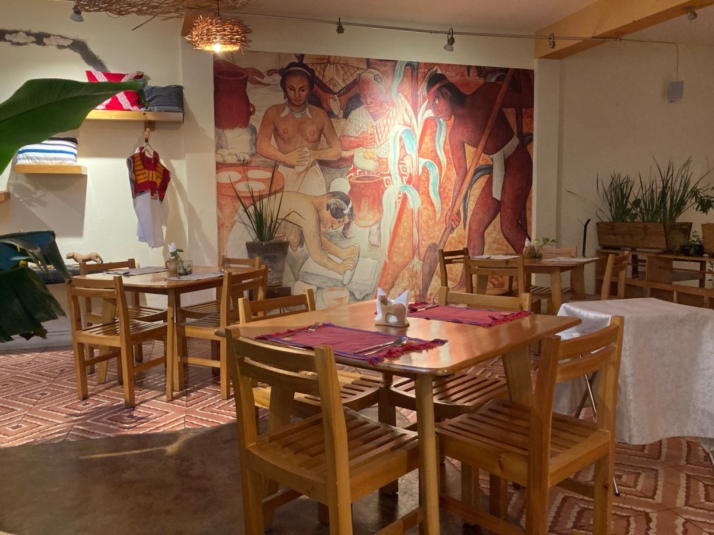 Dinner was at La Olla, a long standing local restaurant with veggie choices and in fact we both had a yellow mole flavoured with yellow chilhuacle chili and thickened with corn.