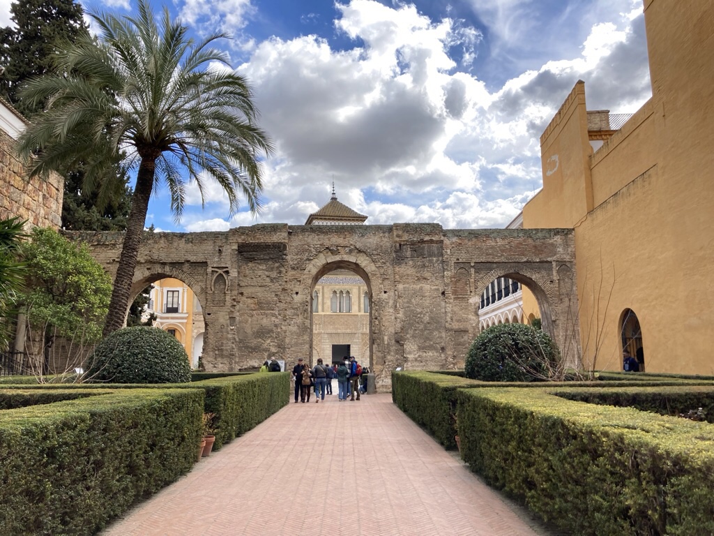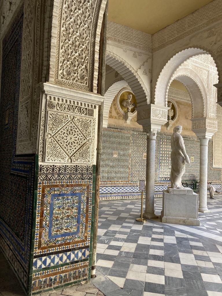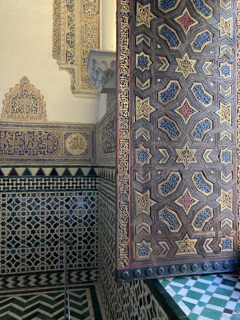 Nonetheless, we have spotted several different types as we’ve been looking round. The earliest tiles in the 13th century were alicatados, where tiles were glazed in a single colour, cut into geometric shapes, and then assembled to form geometric patterns like these in the Alcazar.