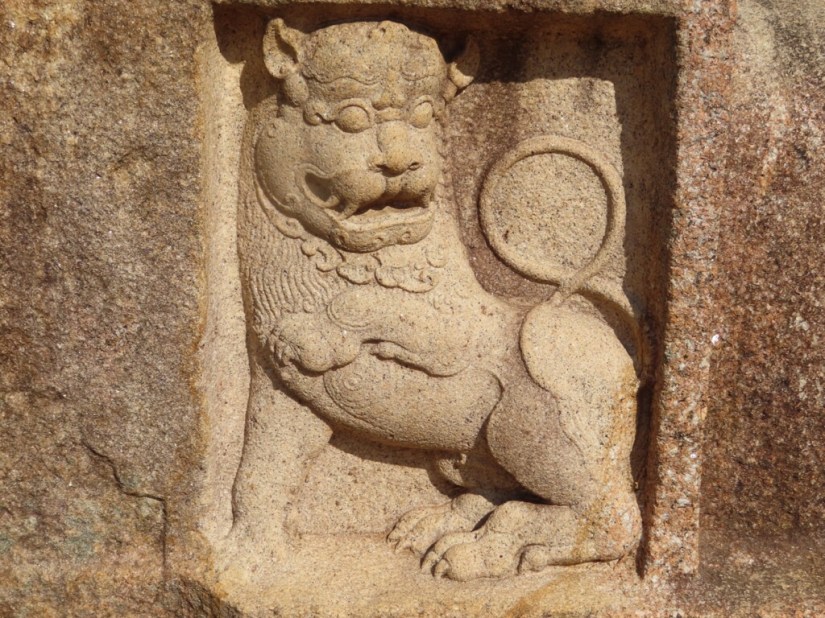 The moonstone is a semi circular stone at the entrance to shrines meant to concentrate the mind of the worshipper before entering. This one clearly shows all the main features – flames on the outside to purify, the four Buddhist animals – the elephant for birth, the horse for old age, the lion for illness and the bull for death, vines for attachment to life, geese for purity and a lotus at the centre as the symbol for Buddha and nirvana.