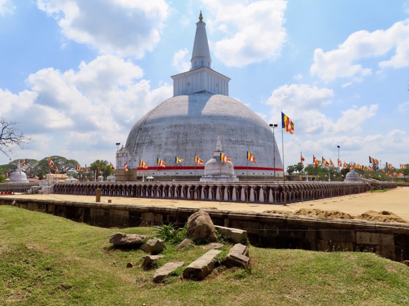 Just close by was the very revered Ruwanwelisaya dagoba which contains various remains of the Buddha and was commissioned by Dutugemunu who evicted the Tamils and united the island under Sinhalese rule for the first time in 161BC. Needless to say, being so revered, it has undergone regular renovations. It is huge, with the strip of red ribbon measuring 300m and we had to step quite a way back to get a good view, especially to include all the elephants symbolically supporting the weight.
