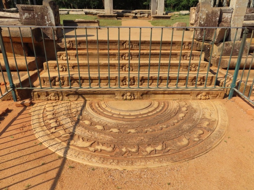 The moonstone is a semi circular stone at the entrance to shrines meant to concentrate the mind of the worshipper before entering. This one clearly shows all the main features – flames on the outside to purify, the four Buddhist animals – the elephant for birth, the horse for old age, the lion for illness and the bull for death, vines for attachment to life, geese for purity and a lotus at the centre as the symbol for Buddha and nirvana.