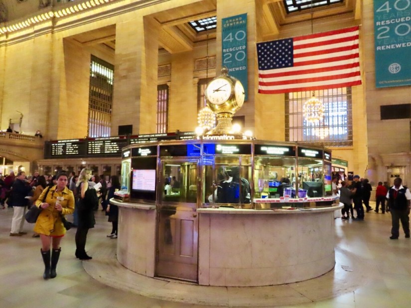 The four-faced brass clock on top of the information booth is a popular meeting point and apparently conceals a secret spiral staircase that leads to another information booth on the lower level.