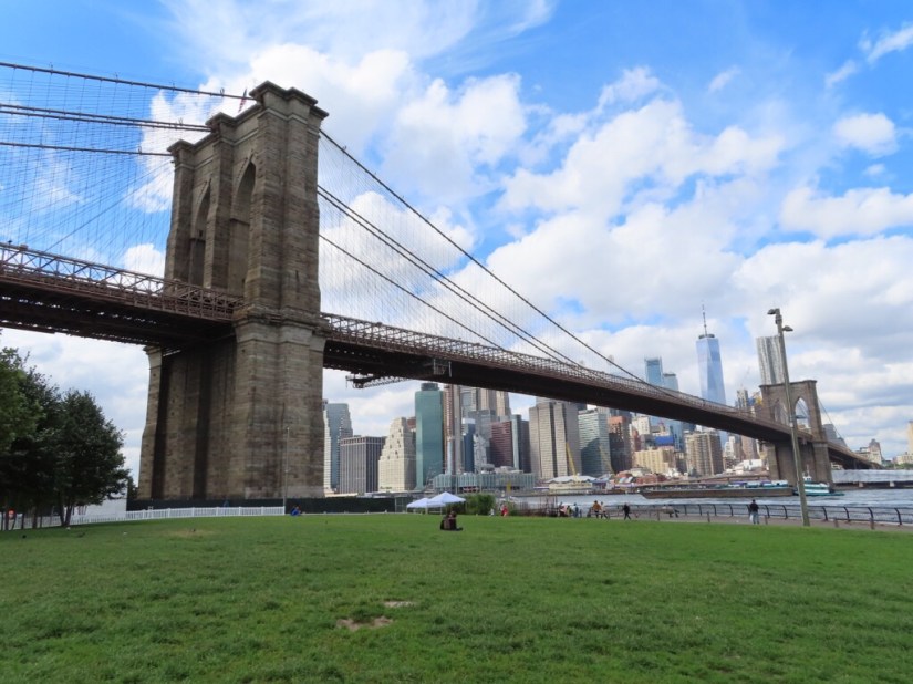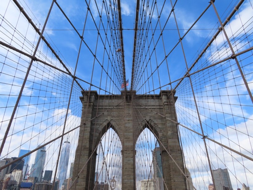 Next, up to the Brooklyn Bridge. This bridge is almost as much of an icon to New Yorkers as the Empire State Building, especially as when built in 1883 it was the world’s largest and longest suspension bridge for 20 years. We walked along the central walkway, careful to avoid the cyclists whizzing along beside us, and got great views as we approached the Financial District of Manhattan.