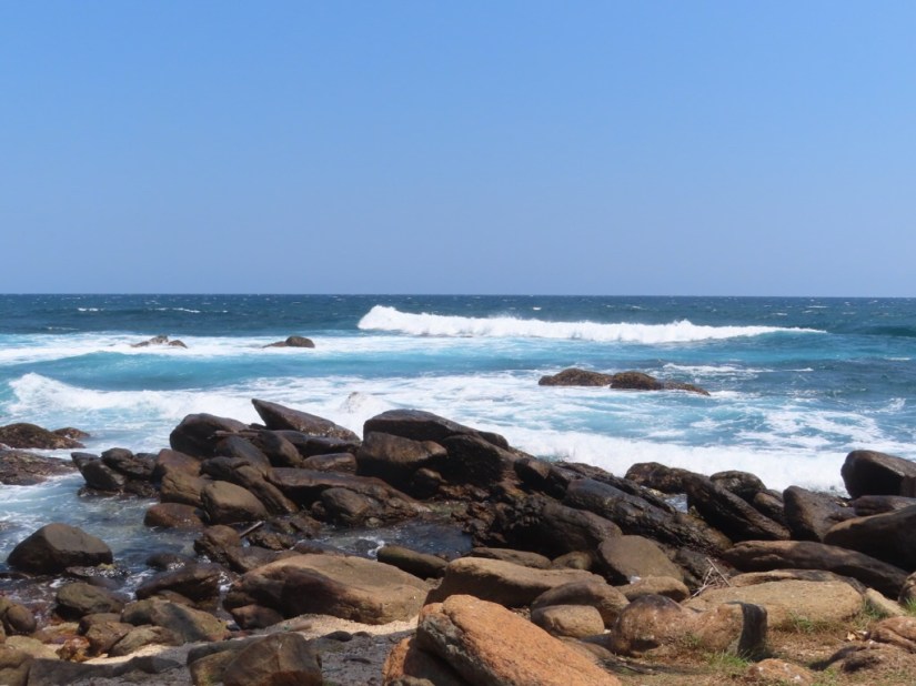 Tangalle, (pronounced Tan-Gaul), is a pretty sleepy place on the south coast and we are staying at Cinnabar Resort, beautifully designed with a rustic laid back feel to it. Here is our first view of the sea as we checked-in.