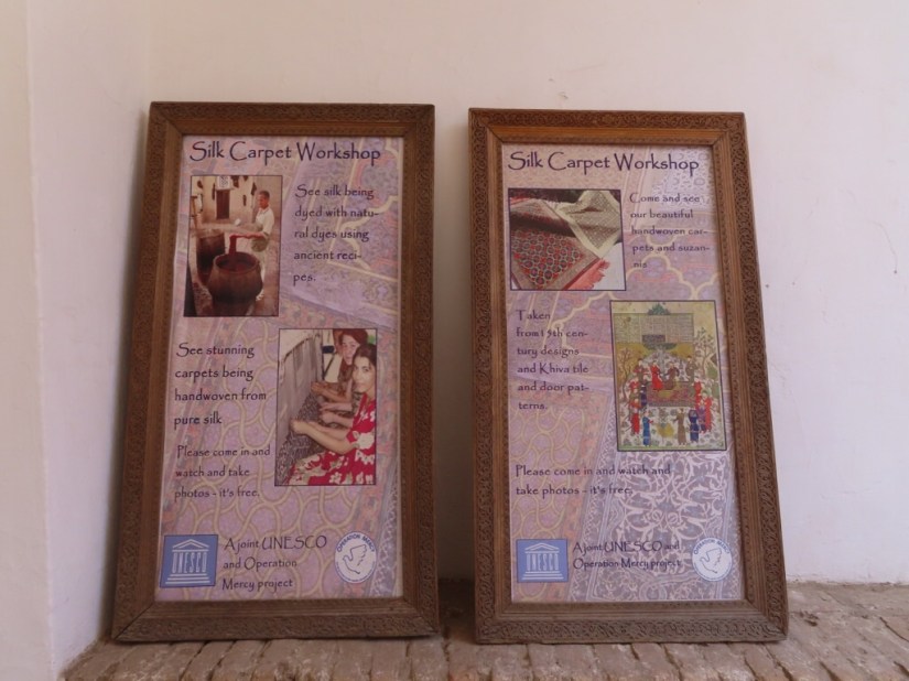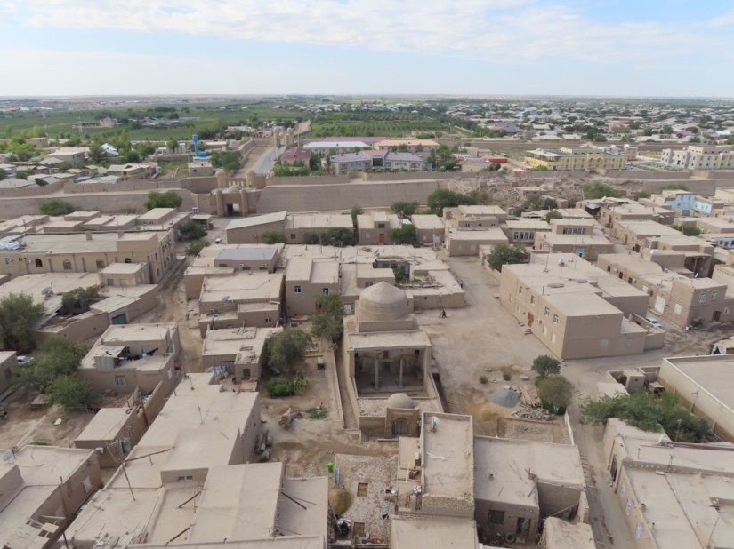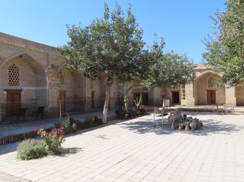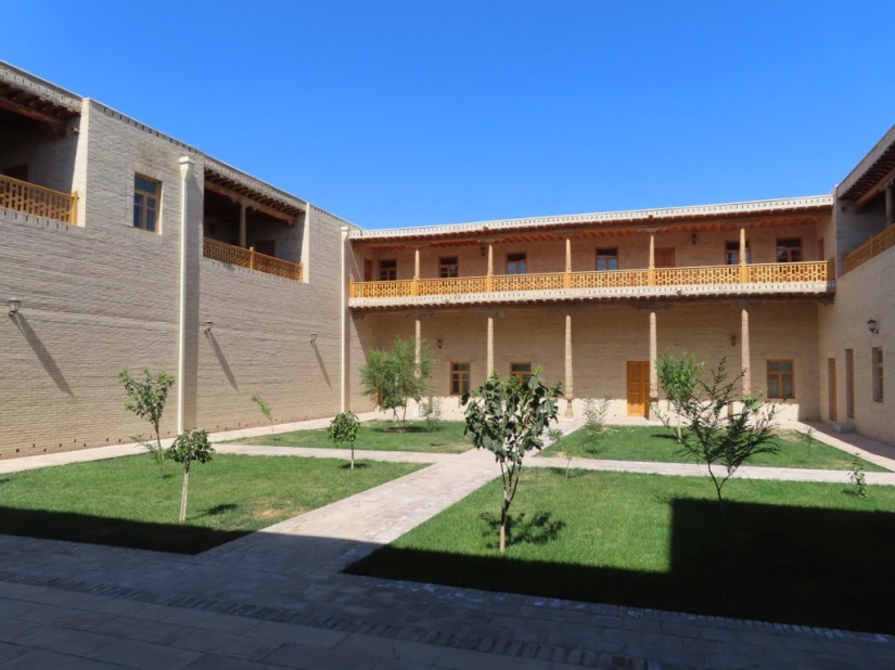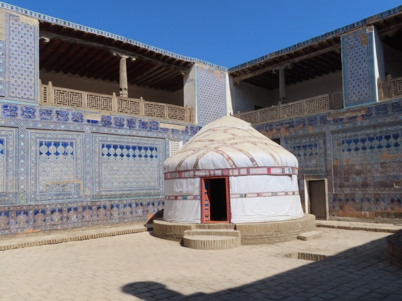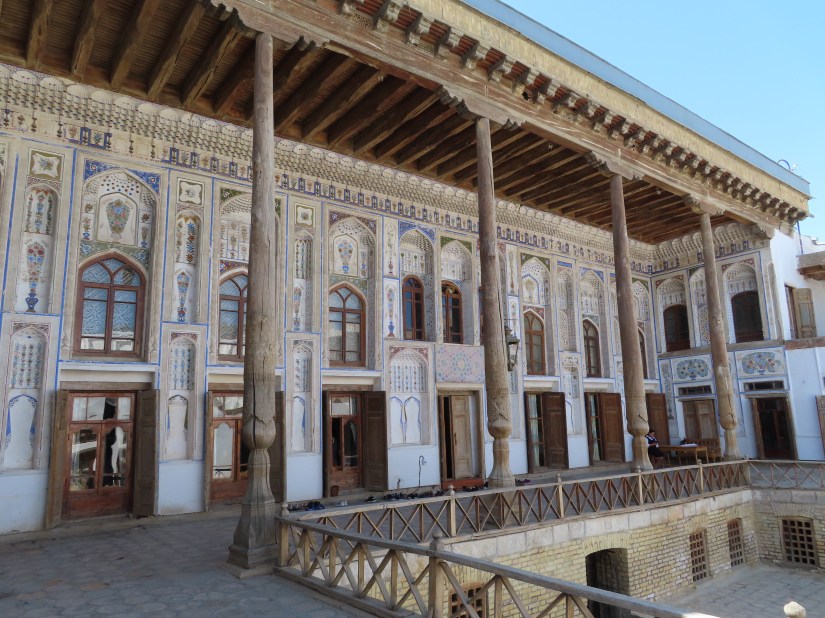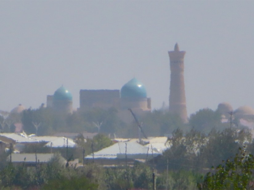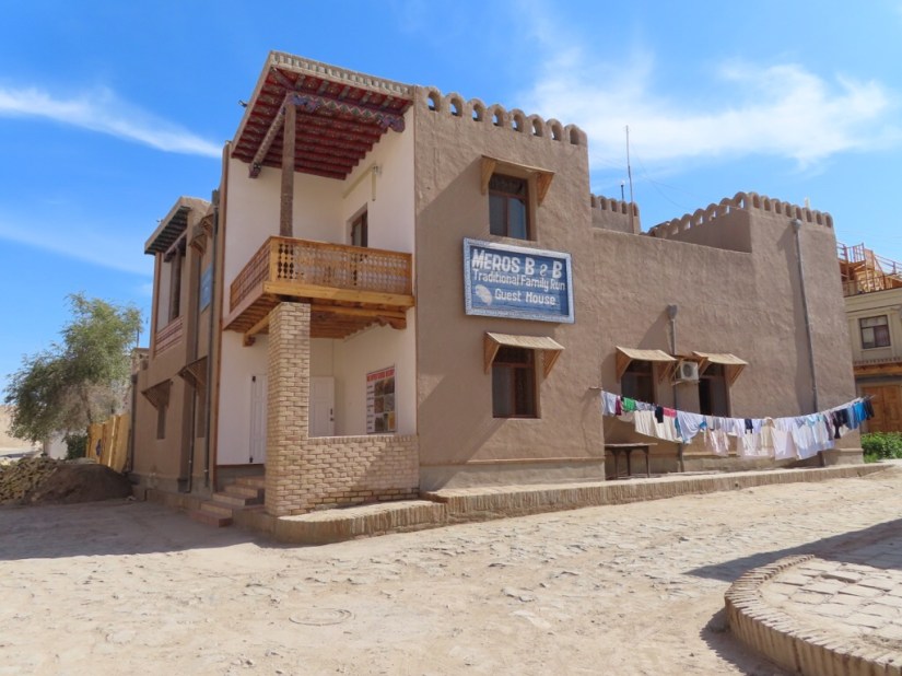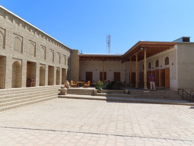 The train chugged along for 6hrs and 400km, passing cotton field to begin with, then desert and finally more cotton as we approached Bukhara, so rather than spend time looking out of the window, I finally had a chance to get stuck into my book. I mentioned The Carpet Ride to Khiva in one of the last posts, but had read little more than the introduction but reading further, I began to suspect that the house at No 57 where the author stayed in Khiva is now Meros B&B … and having checked with Jaloladdin, he confirmed Aslan had lived with his family for 7 years and they still keep in touch … small world!