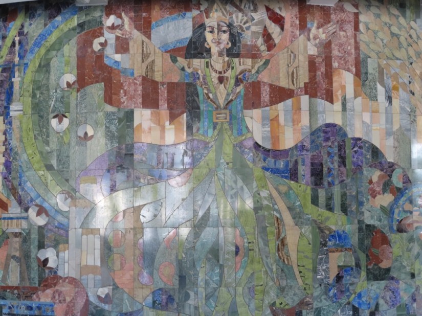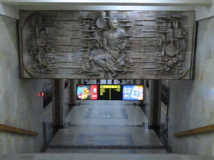 Amir Temur Khiyoboni station is the former October Revolution station and here is a Red Army soldier waving a blank flag that apparently had its hammer and sickle removed …