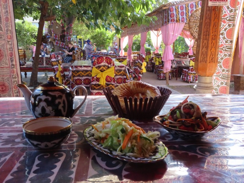 … the purchase of some cream and pink adras fabric to recover a cushion at home … another T-shirt for Chris … some local snacks at the market including dried melon and walnut stuffed apricots … and finally a teapot and cups to remind us of our trip. We then retired to a tempting tapchan in Bibikhanum Teahouse for a late lunch.