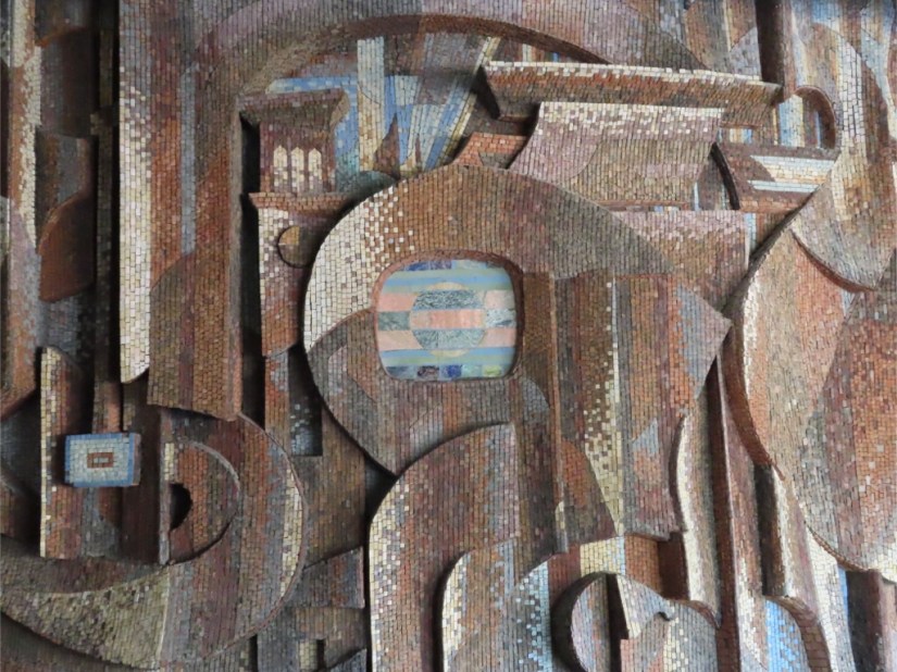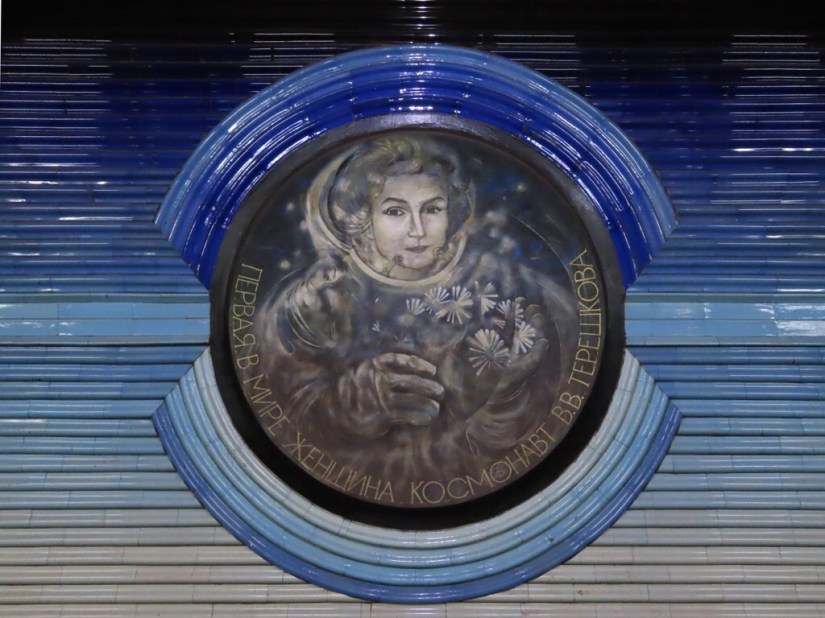 … and inside the ceramic wall panels fade from blue to black in imitation of Earth’s atmosphere with cosmonauts including Valentina Tereshkova, the first woman in space.