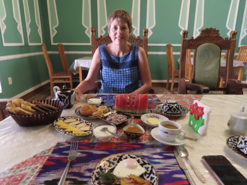 We have drunk so much tea, not surprising at anything from 17p to 85p for a pot for two – and what’s more it’s so eco friendly, far better than drinking water from plastic bottles! We tried the green but it tastes a bit smokey and a bit like veg water so we prefer the black. In Hotel Khurjin in Bukhara they served particularly delicious tea made in Russia called Tess Pleasure which is black tea with pieces of wild rose, dried apples and delicate cornflower petals and we have bought some to bring home.