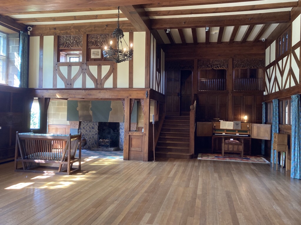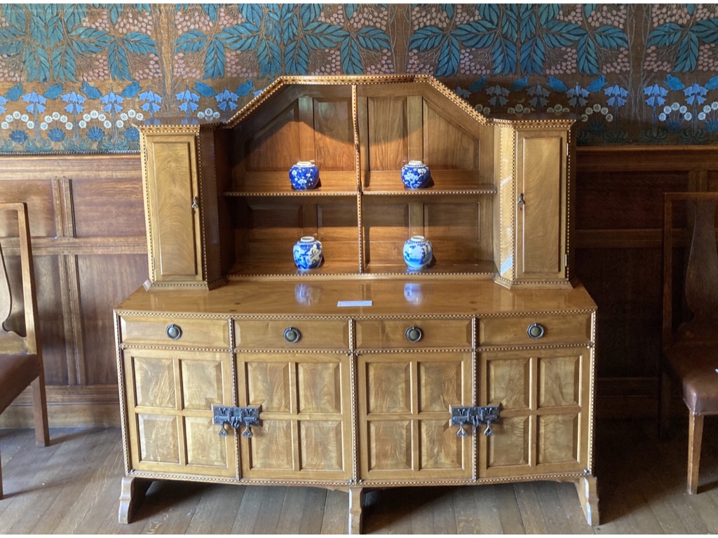 Blackwell gave Baillie Scott the chance to put his ideas on the use of space, light and texture into practice on a grand scale and as it didn’t need to be quite so practical as a main home, there was more scope to experiment. The main hall shows influence from old baronial halls, but is also modern, with plenty of room for the billiard table which would have stood under the six copper lights and the piano for musical evenings. There are also places to retreat such as into the minstrel gallery or by the fire with a book. At first glance, the peacock frieze appeared to be mosaic, but looking closer, it is wallpaper which took nine months work to conserve but looks amazing.